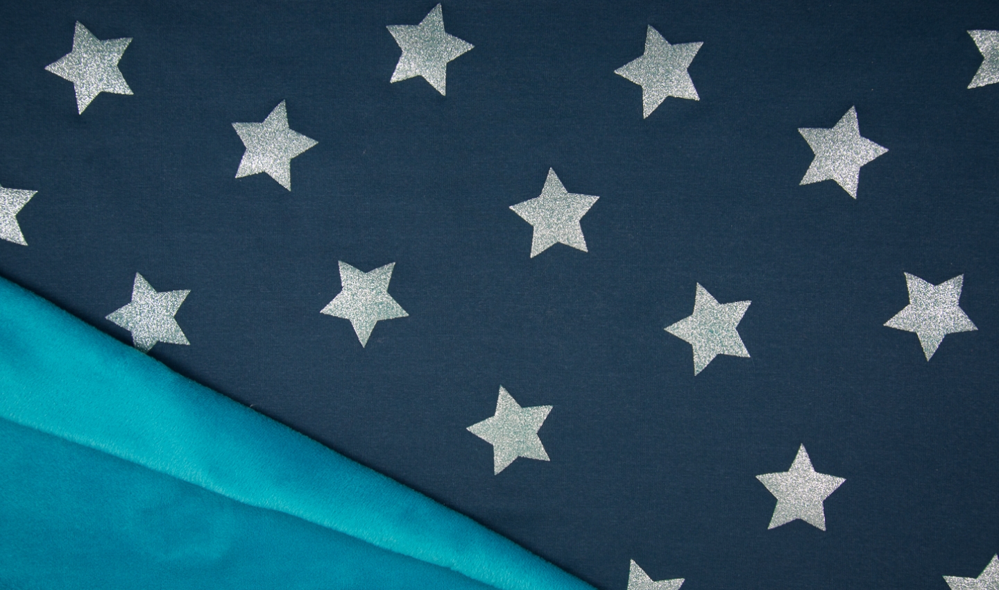Hier biete ich Euch einen tollen Alpenfleece/-sweat an. Die Vorderseite ist Sweat in petrol mit glänzenden silbernen Sternen. Die Rückseite ist kuscheliger Wellnessfleece in einem kräftigen türkis.