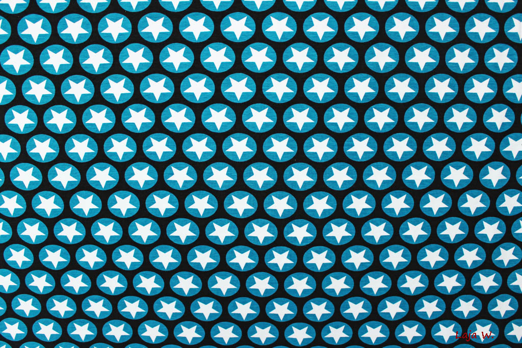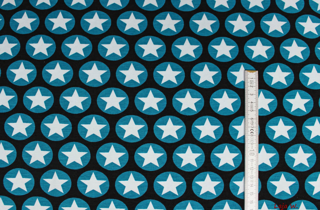Hier biete ich Euch einen absolut traumhaften Bio Stretch-Jersey mit vielen weißen Sternen auf petrolfarbenen Kreisen nach dem Design von "Hamburger Liebe" an. Der Untergrund ist in der Farbe schwarz gehalten. Daraus lassen sind coole Shirts oder andere Accessoires für kleine und große Mädchen oder Jungs nähen.