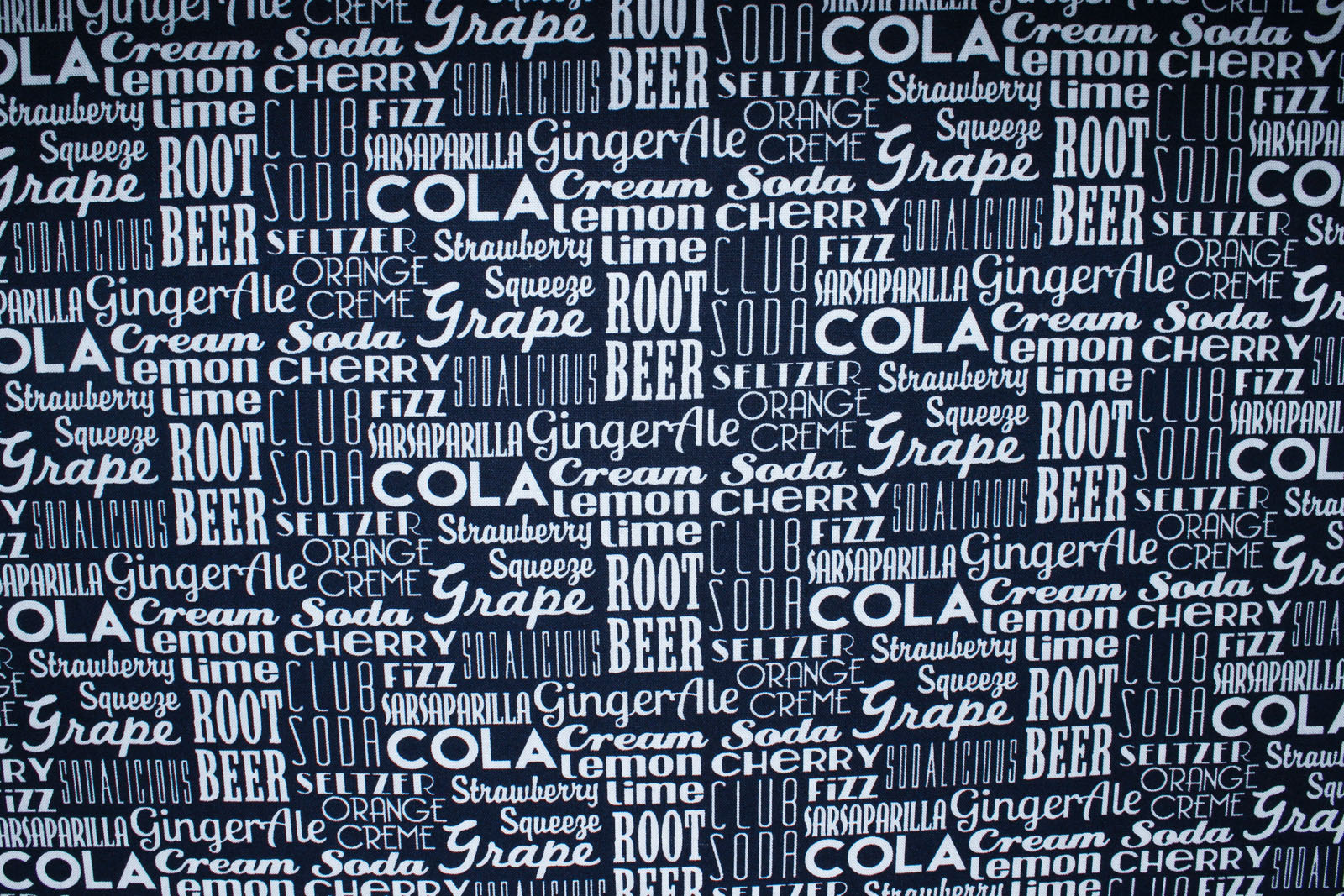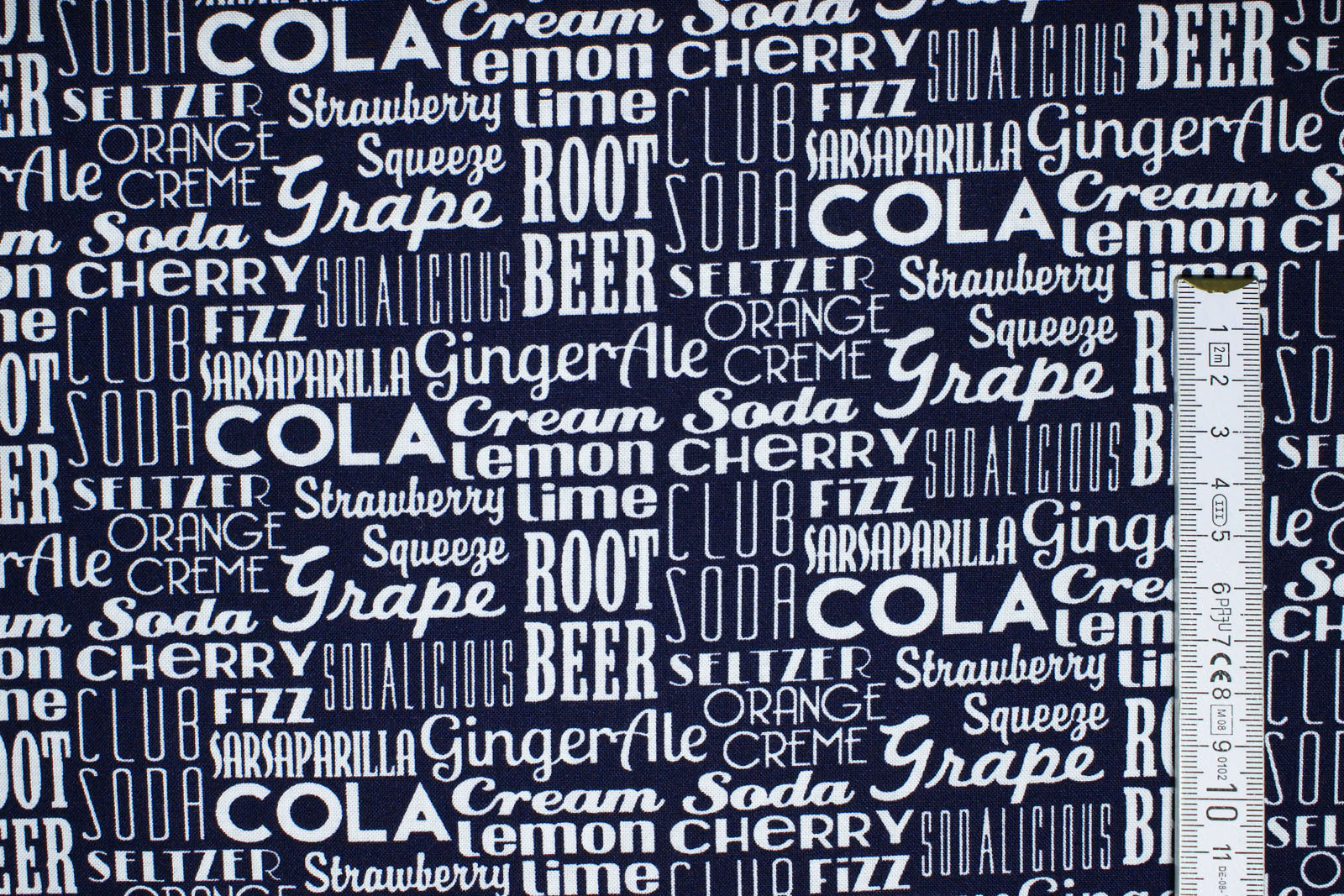 usw.Hier biete ich Euch einen tollen Designerstoff "SODALICIOUS" aus dem Hause Michael Miller mit Schriftzügen beliebter Getränke an. Der Untergrund des Stoffes ist dunkelblau.
