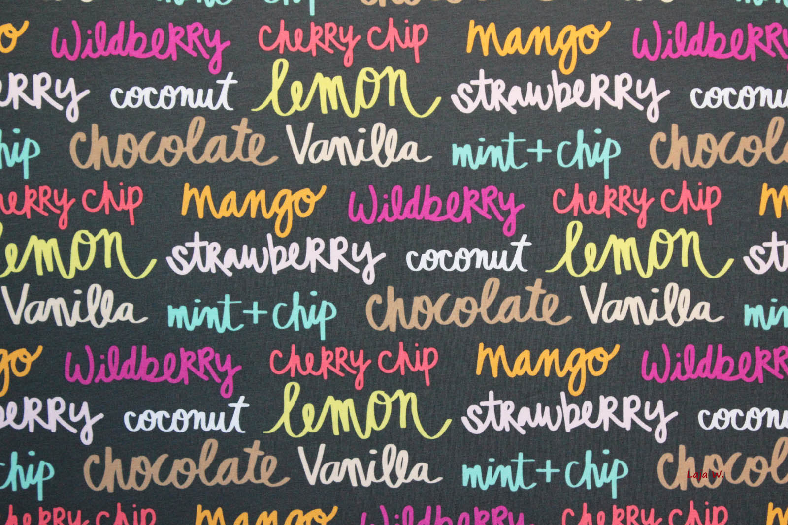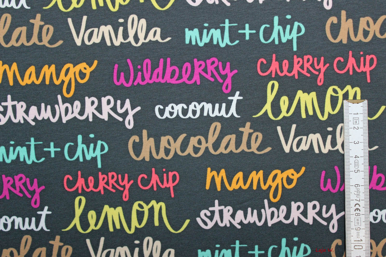 Hier biete ich Euch einen absolut tollen Jersey der Firma Art Gallery an. Der Untergrund des Stoffes ist grau, die Schriftzüge sind 2-3 cm hoch.