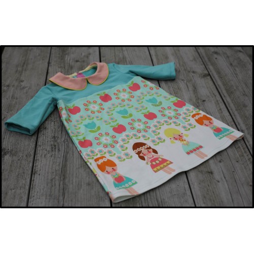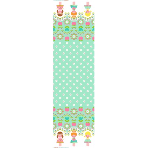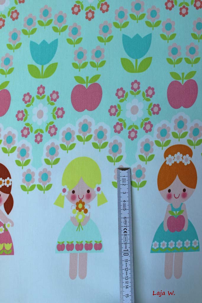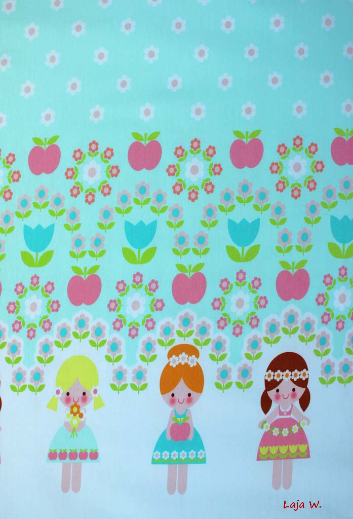 Der Jersey hat an beiden Rändern eine Art Bordüre mit Blumenmädchen, die sich ca. alle 30 cm wiederholen