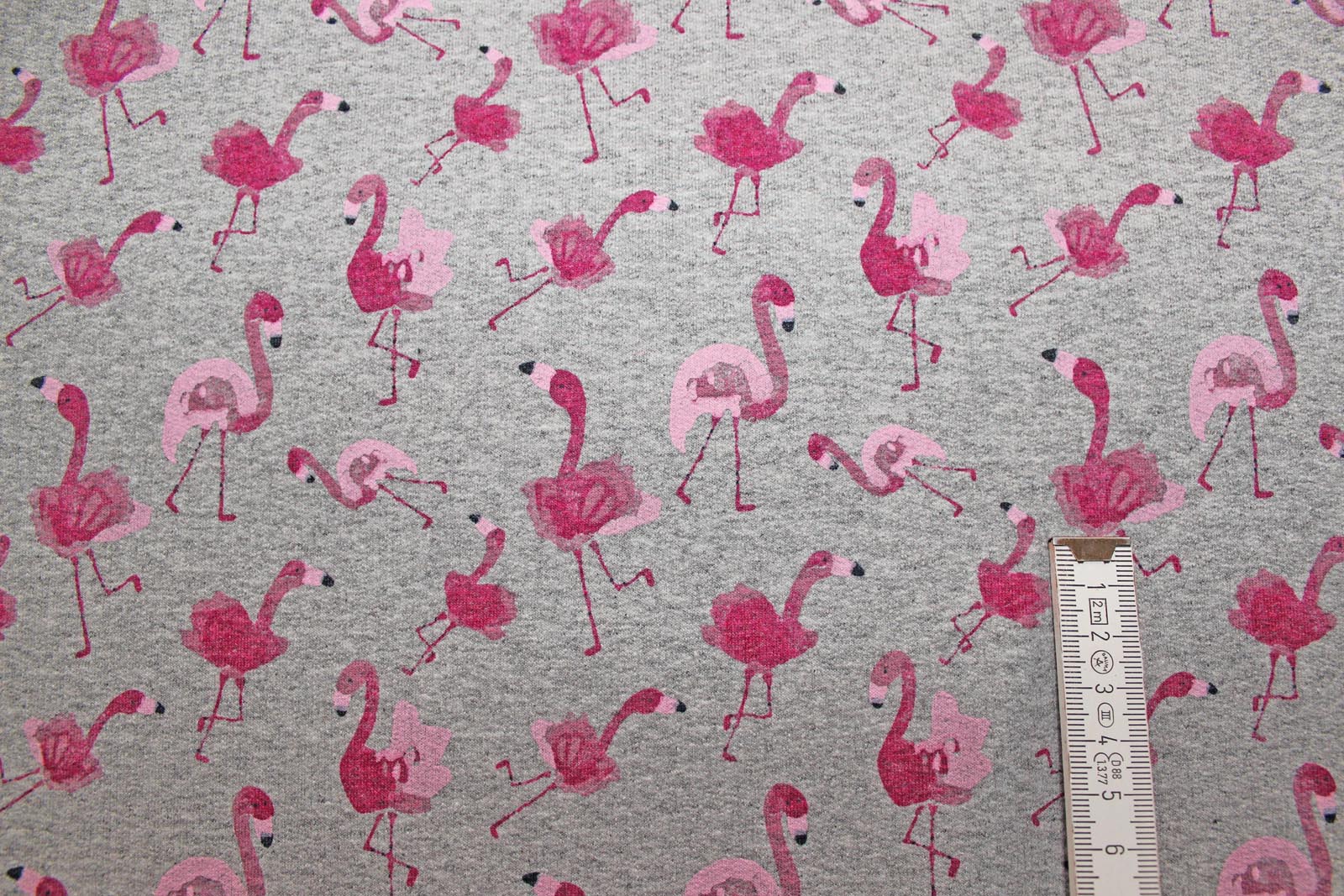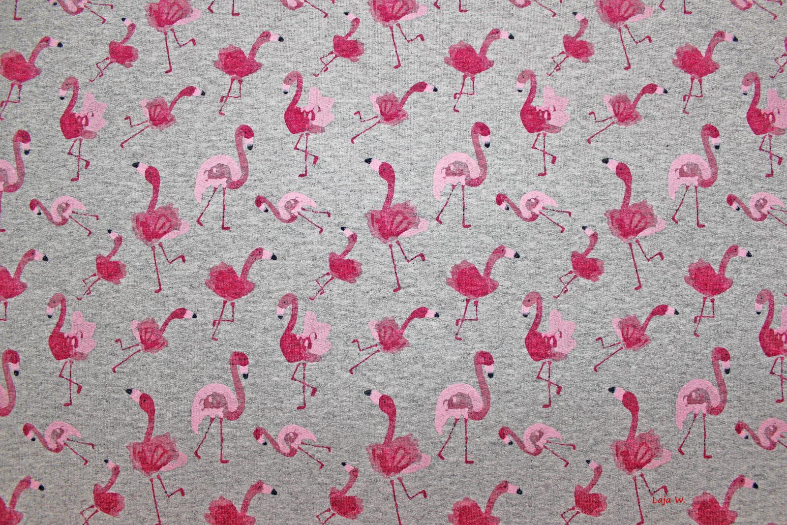 French Terry ist ein ganz leichter Sommersweat. Hier in hellgraumeliert mit Flamingos. Durch die Dehnbarkeit und dadurch, dass der Sommersweat schön dünn ist, eignet sich der Stoff nicht nur für Hoodies, sondern ebenfalls für etwas wärmere Langarm-Shirts, Mützen, Pumphosen.