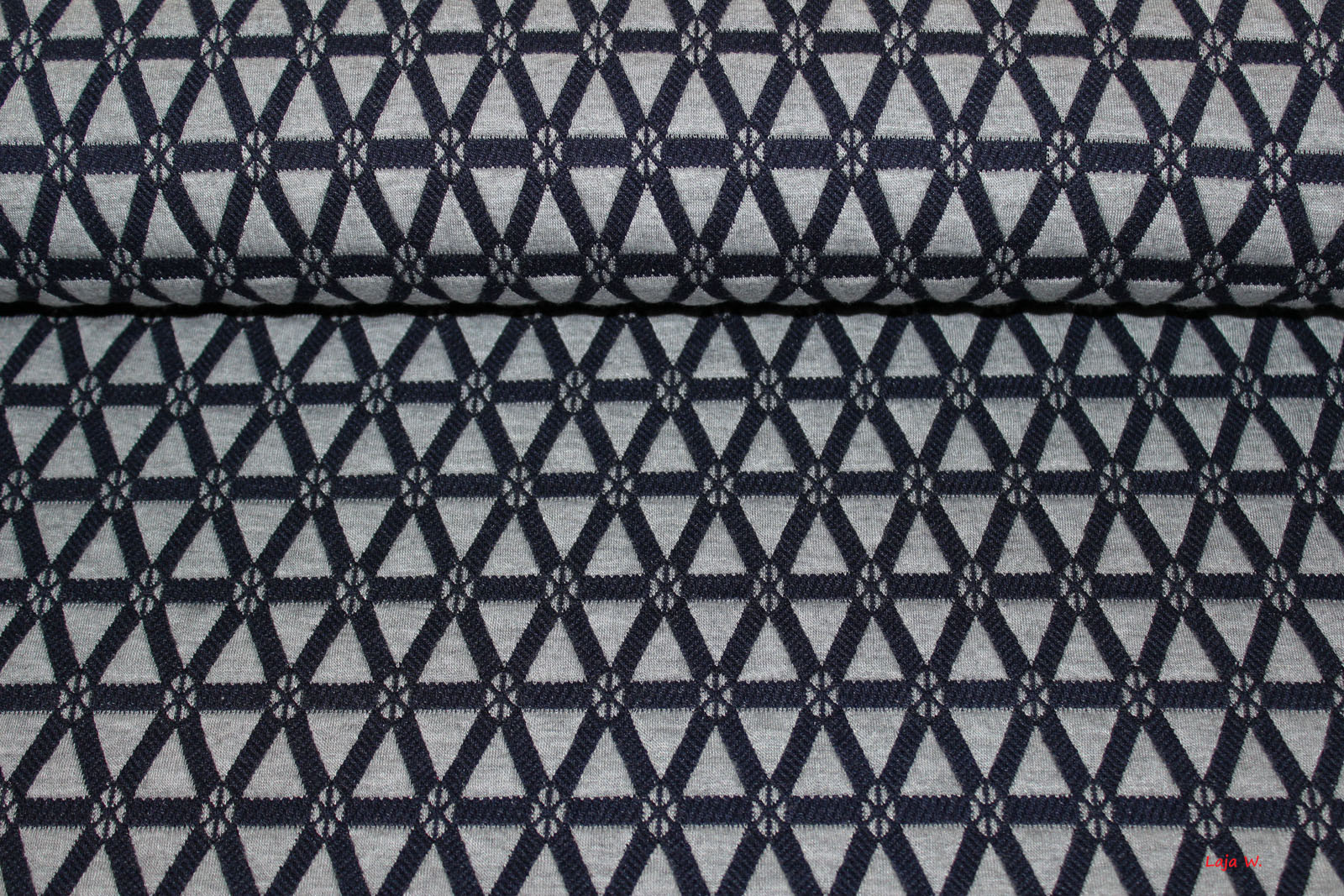 usw.Jacquardjersey "Mia Pull" aus dem Hause Hilco in graumeliert mit dunkelblauem geometrischen Muster. Super geeignet für Pullover, Hoodies, leichte Jacken, Ponchos uvm.
