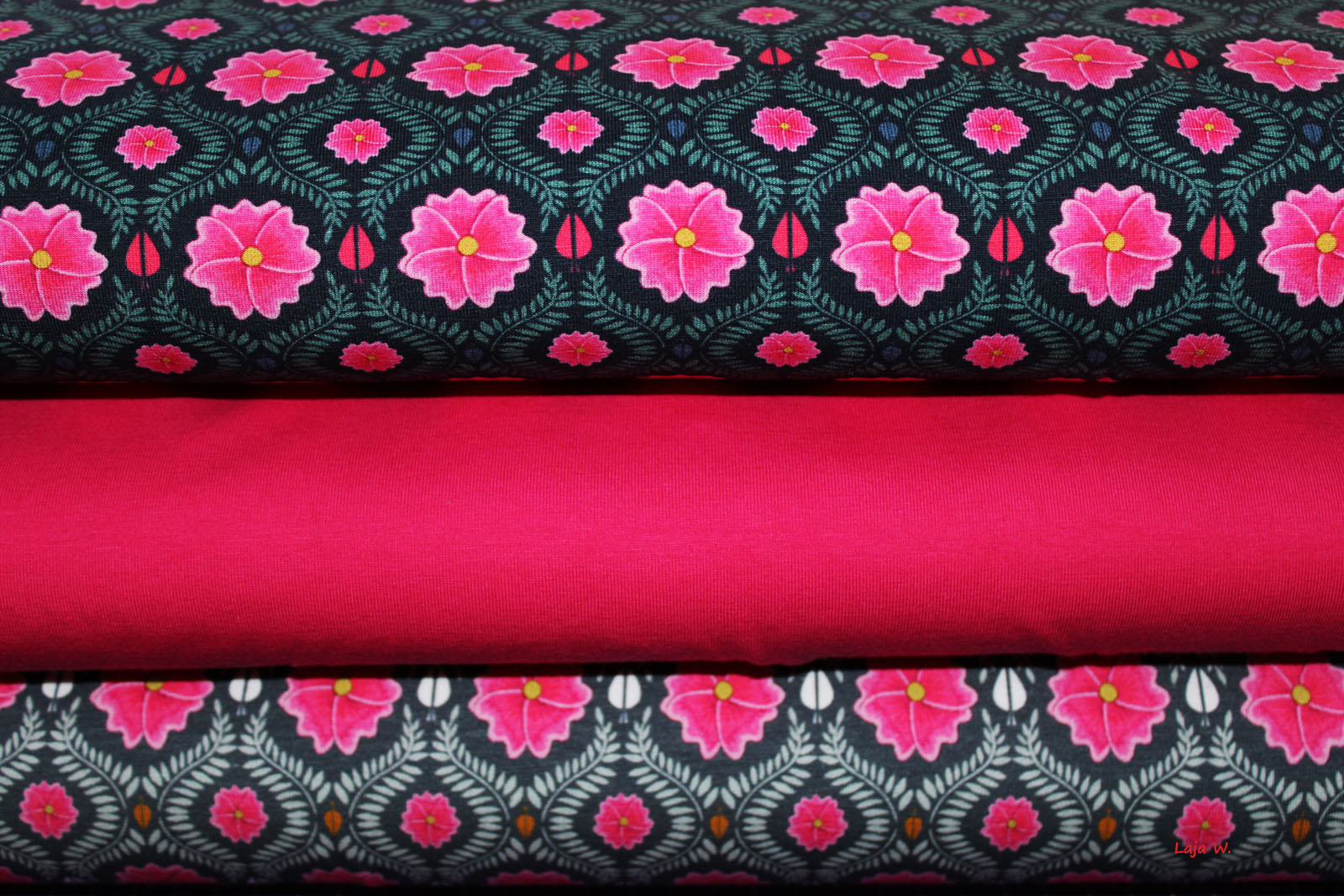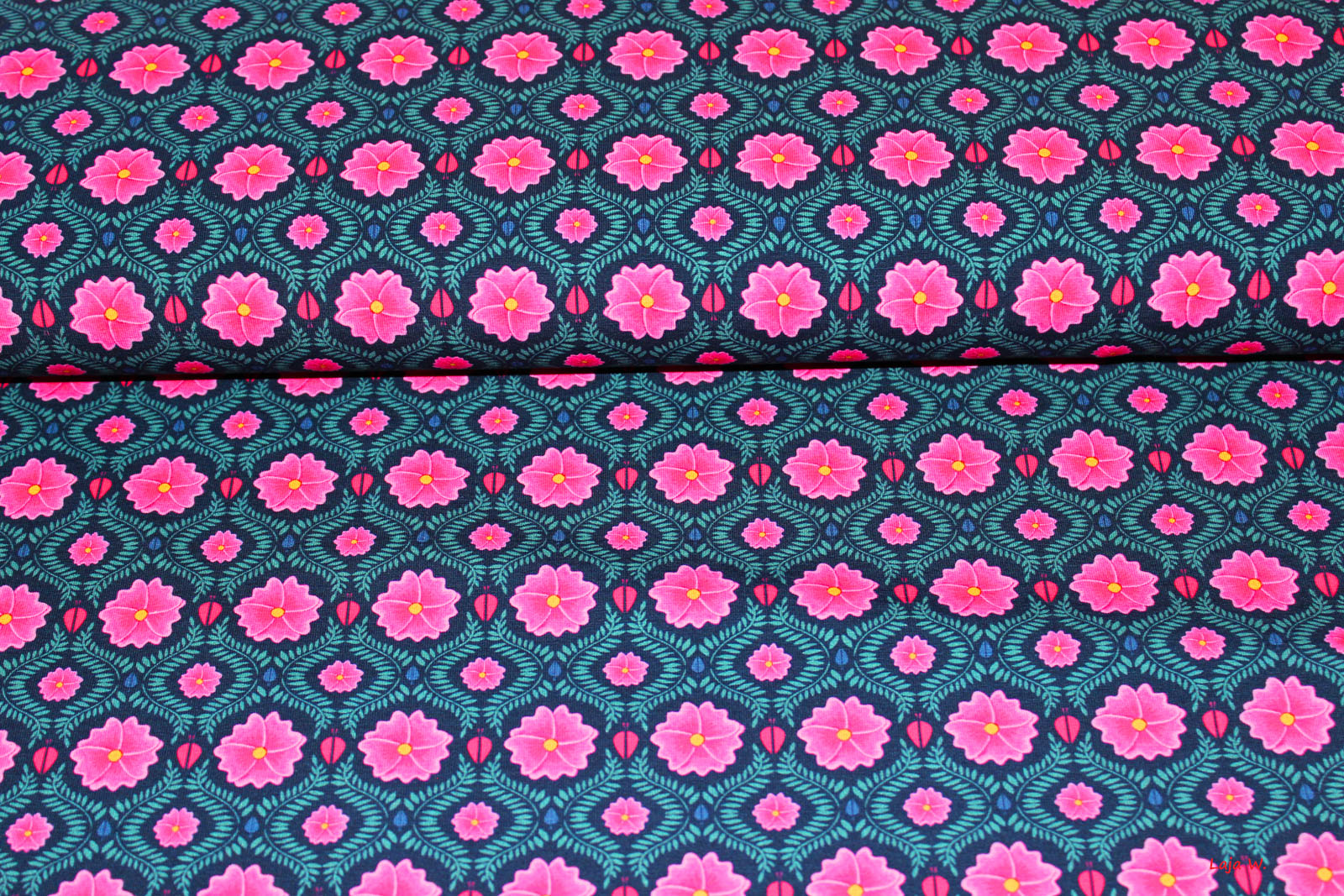 Jersey "Orchid Bliss" aus der Feder der Designerin "Jolijou", ein hochwertiger, weicher und glatter Jersey für Shirts, Kleider, Beanies, Pumphosen und co. Der Untergrund ist ein Zwischenton zwischen dunkelblau und schwarz.