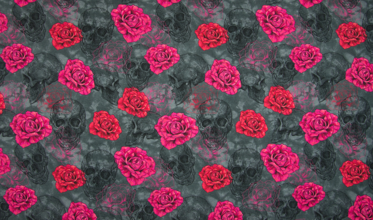 Digitaldruck-Jersey "Romantic Sculls" für Shirts, Leggins, Hoodies, Pumphosen und co. Die Totenköpfe sind zwischen 9,5 und 11 cm hoch.
