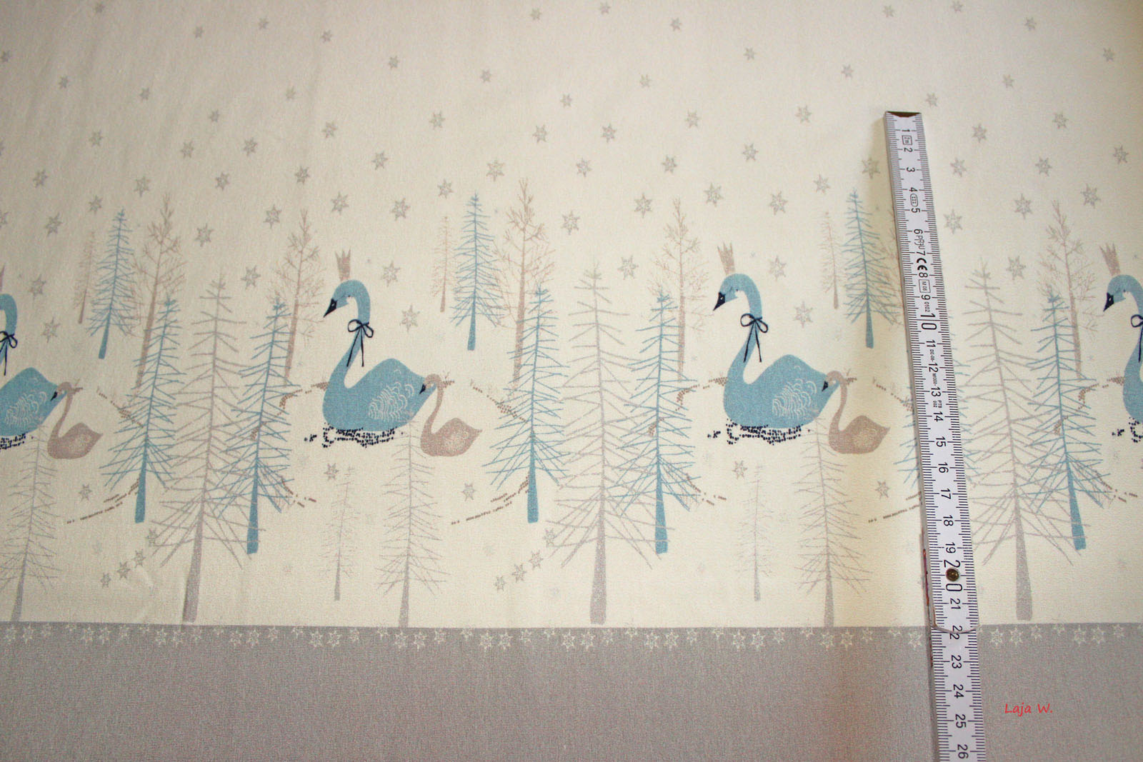 Hier biete ich Euch einen hochwertigen, glatten und weichen Jersey der Firma Hilco mit einer Schwanenbordüre im Digitaldruckverfahren an. Die Schwanenbordüre verläuft beidseits der Strickkante. Ein Motiv ist ungefähr 16,5 cm breit und 24,8 cm hoch. Die Jerseys dieser Firma verarbeite ich selbst sehr gerne, da hier einfach die Qualität absolut stimmt. Es macht Spaß diesen Jersey zu verarbeiten- nichts verrutscht oder verzieht sich beim Nähen.