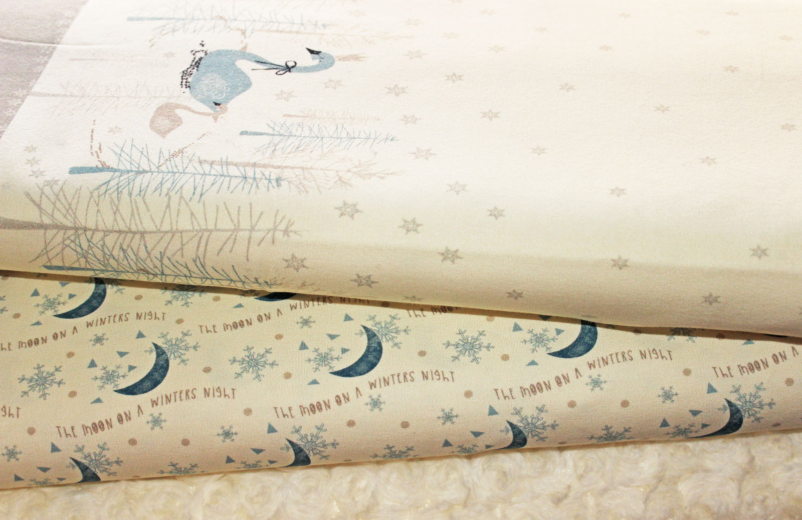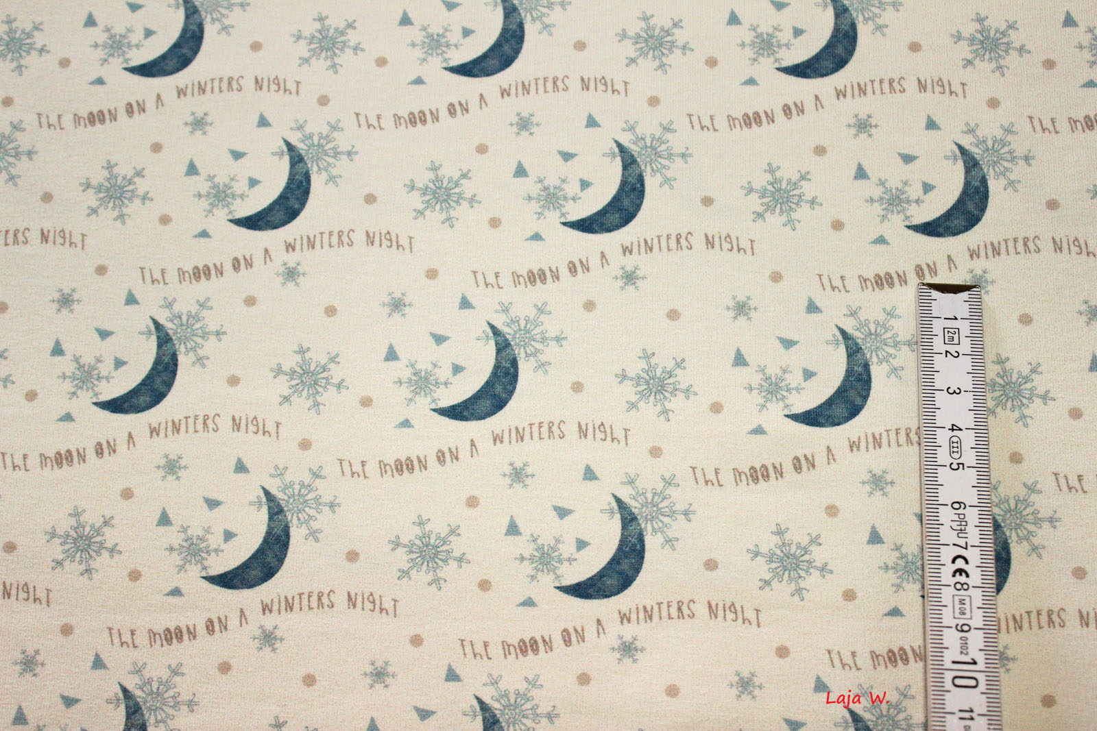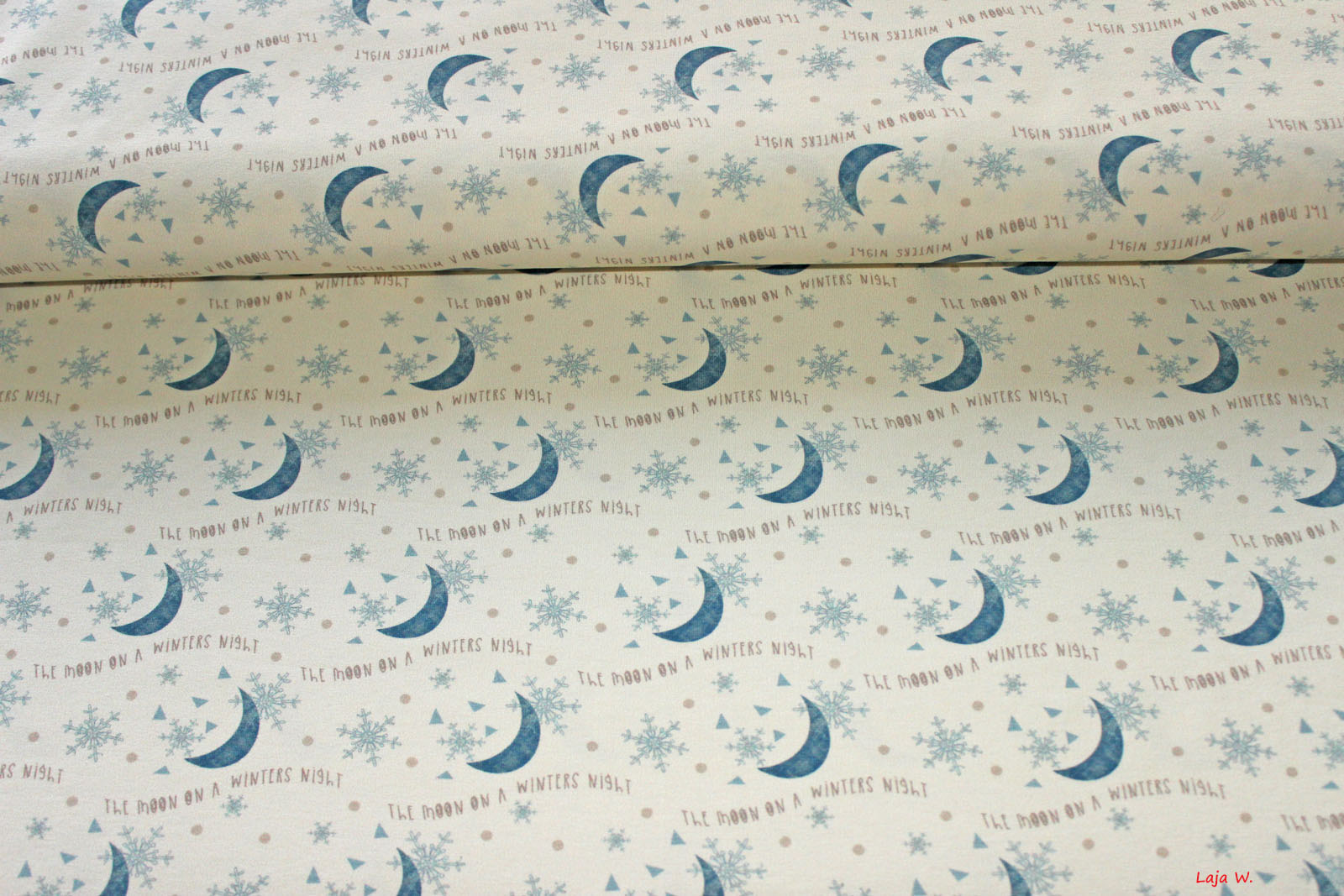 Hier biete ich Euch einen hochwertigen, glatten und weichen Jersey der Firma Hilco mit Monden, Schneeflocken und einem kleinen wiedderkehrenden Schriftzug im Digitaldruckverfahren an. Dieser passt sehr gut zum Jersey "Swan-Border". Die Jerseys dieser Firma verarbeite ich selbst sehr gerne, da hier einfach die Qualität absolut stimmt. Es macht Spaß diesen Jersey zu verarbeiten- nichts verrutscht oder verzieht sich beim Nähen.