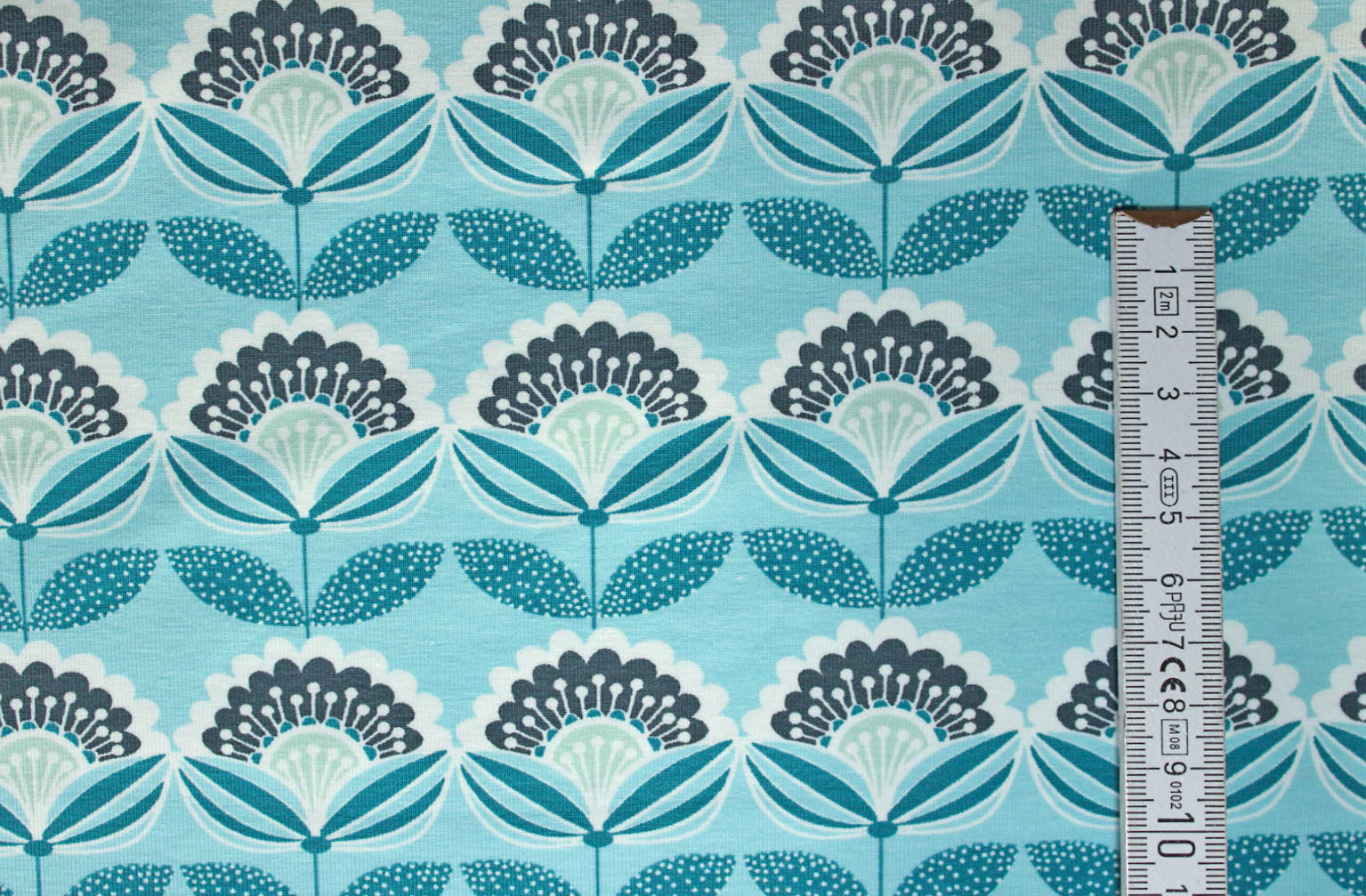 Wunderschöner hochwertiger Jersey "Blütenfächer" aus der Serie "Love and Magic" von "Tante Ema" für romantisch verträumte Shirts, Hoodies, Leggins, Schals, uvm. Der Untergrund des Jerseys ist petrol, die Spitzenblumen sind weiß. Auf dem dritten Foto seht sind noch andere farblich harmonierende Stoffe aus dieser Serie zu sehen. Diese gehören nicht zu diesem Angebot.