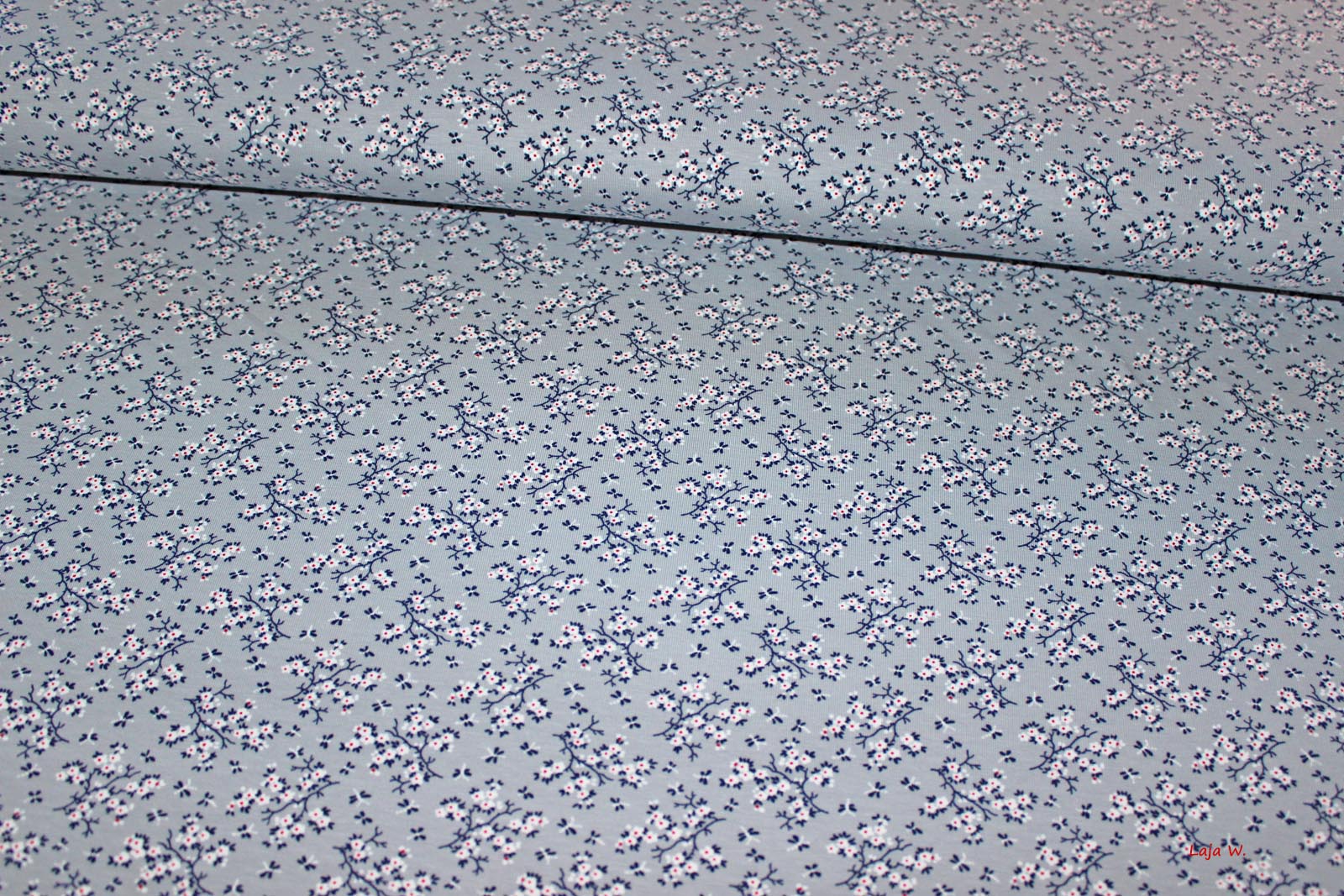 Hochwertiger Jersey in hellgrau. Die Zweige sind dunkelblau und die Blüten weiß mit einem kleinen roten Punkt.