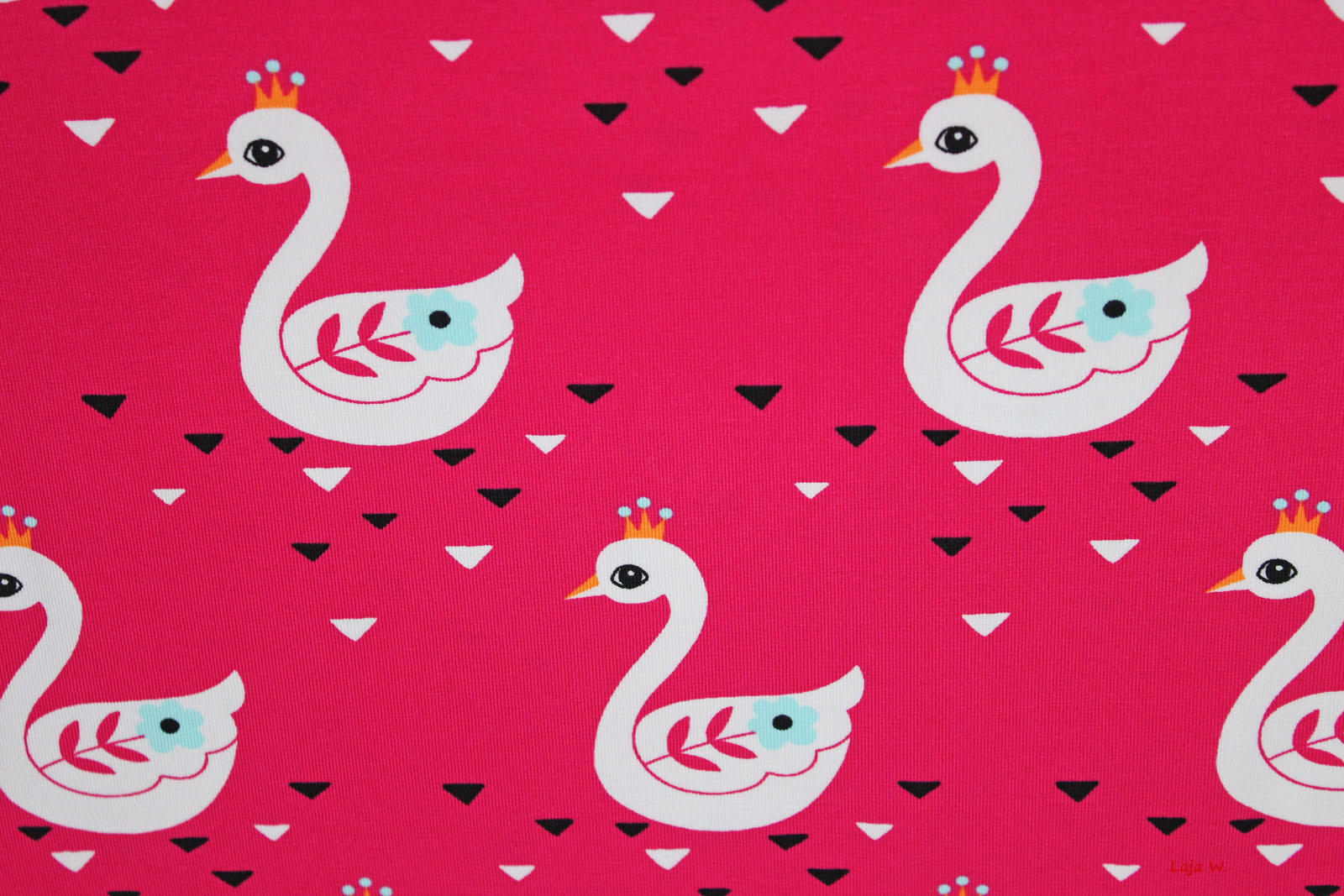 Hier biete ich Euch einen hochwertigen Jersey mit süßen Schwanenprinzessinnen an. Der Untergrund des Stoffes ist pink.