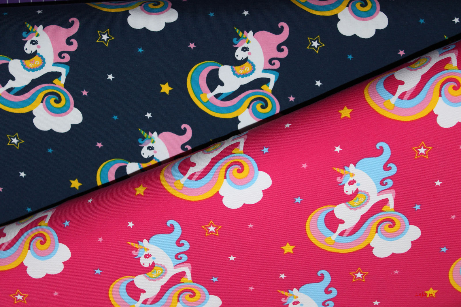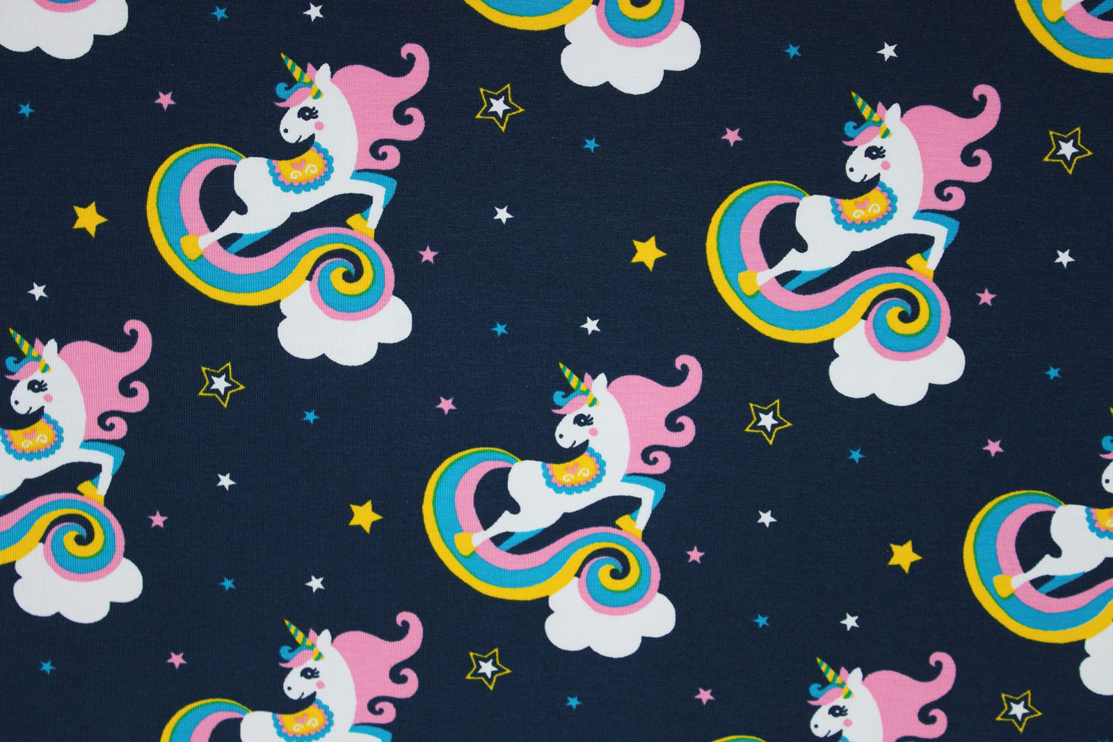 Hier biete ich Euch einen hochwertigen Jersey trendigen Einhörnern an. Der Untergrund des Stoffes ist ein dunkles blau. Die Einhörner haben eine Höhe von ca. 10 cm.