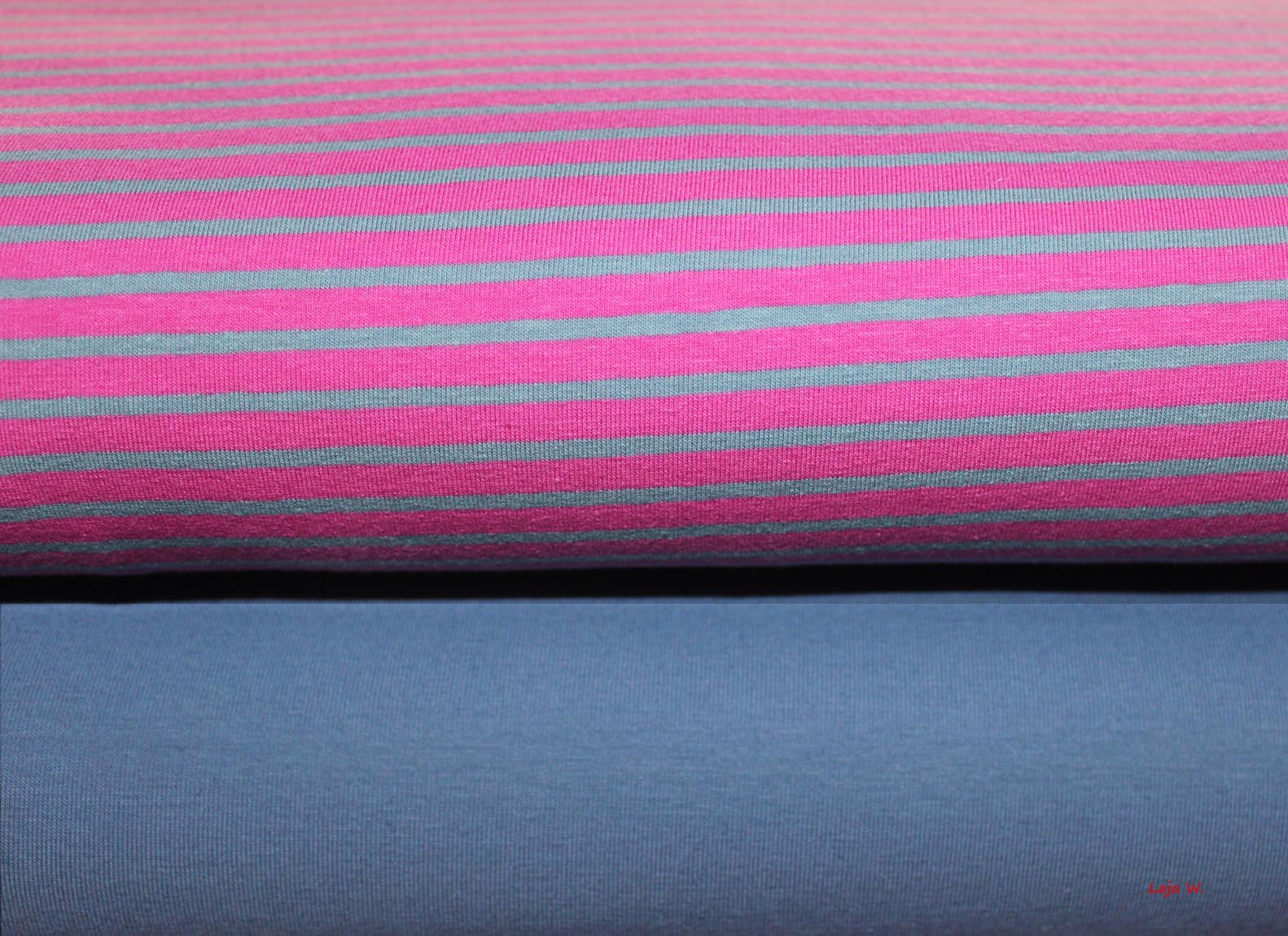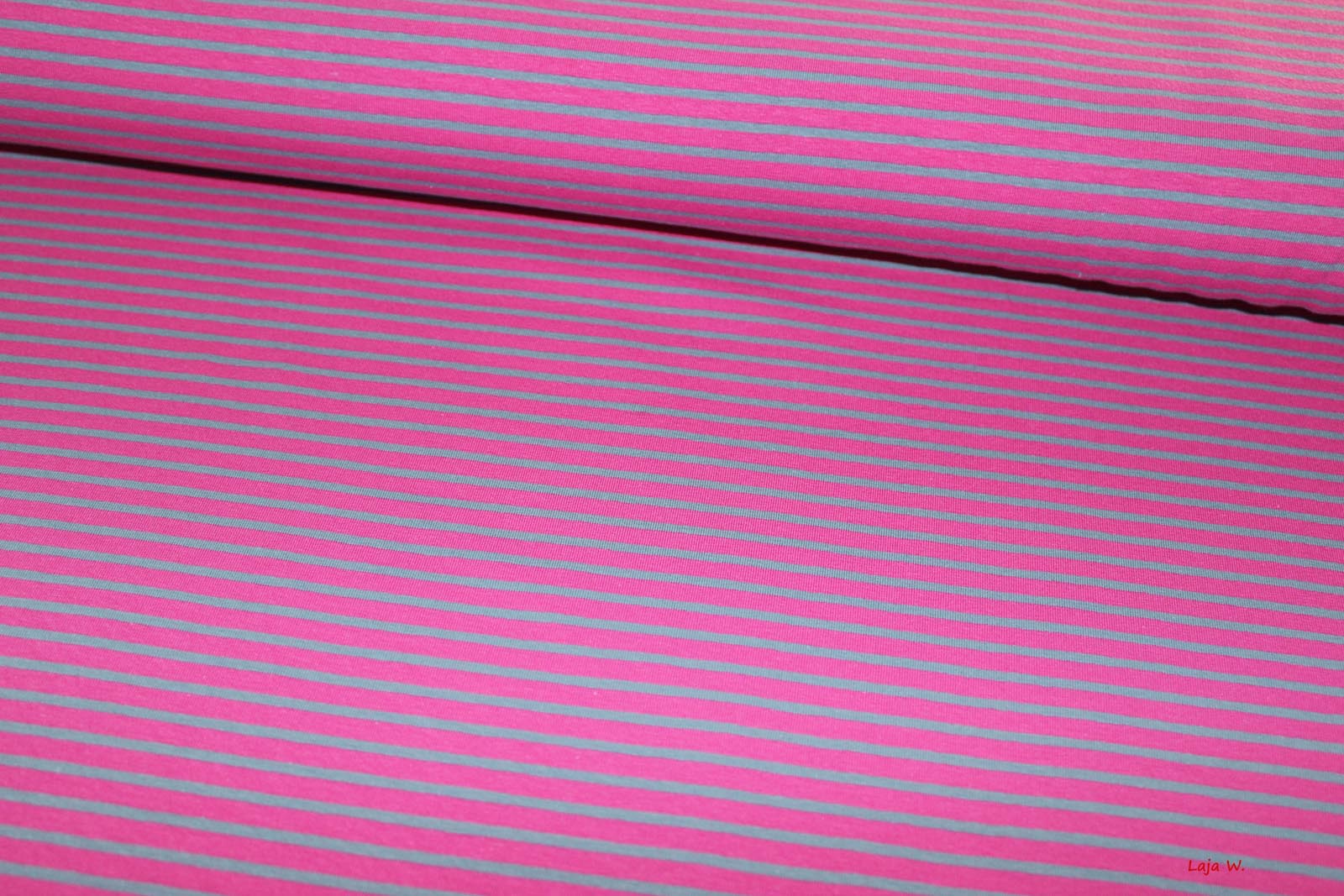 Gestreifter Jersey in pink/blaugrau. Ein idelaer Kombipartner aber auch allein vernäht sehr schön :-) Der graublaue Streifen ist ca. 2,5 mm breit. Aus diesem Jersey lässt sich alles, angefangen von Shirts bis hin zu kleinen Accessoires nähen.