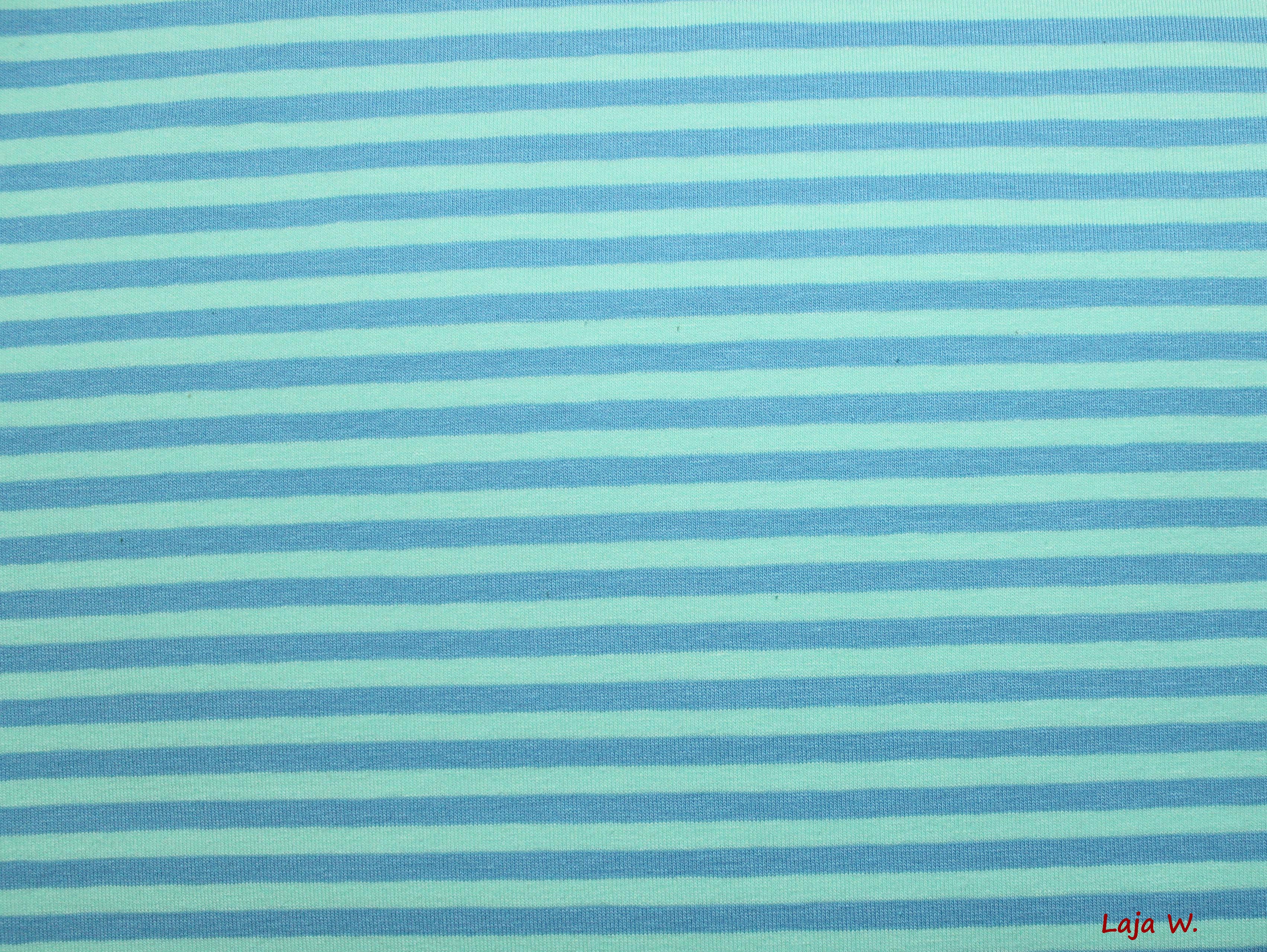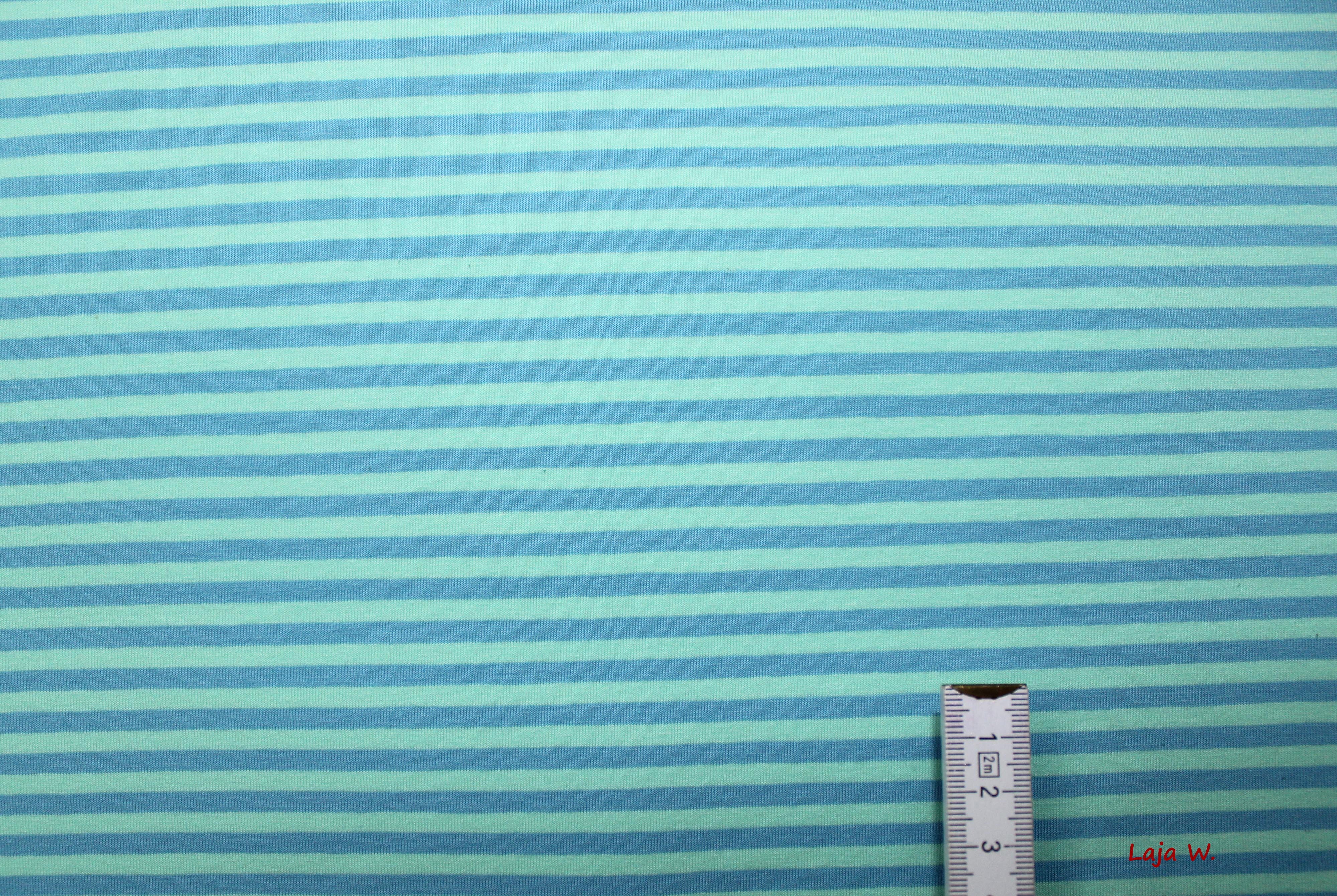 Hier biete ich Euch einen gestreiften Jersey in der Farbe türkis mit hellmintfarbenen Streifen an.