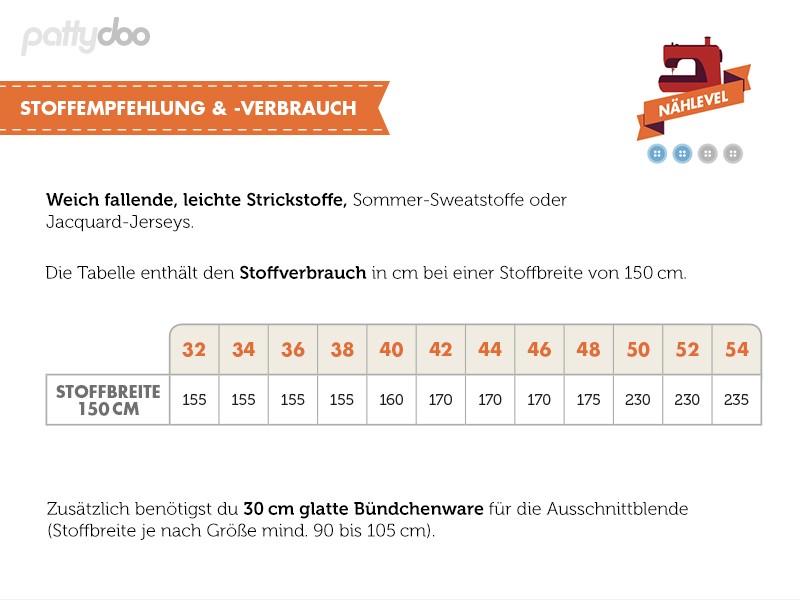 Mit dem Kauf erhältst du ein ausgedrucktes Schnittmuster in der Größe DIN A0 sowie eine Broschüre mit Verweis auf die Videoanleitung, Beschreibung der einzelnen Schritte und weiteren Tipps. Das Schnittmuster enthält alle Schnittteile (Gr. 32 bis 54).