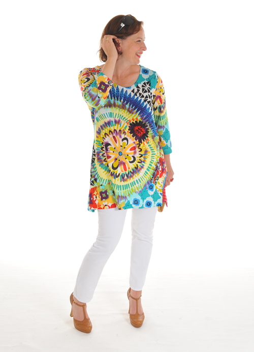 Form: Das Longshirt bzw. die Tunika ist oben herum stylisch schlank und feminin geschnitten (nicht eng!), nach unten fällt es leicht glockig über die Hüfte.