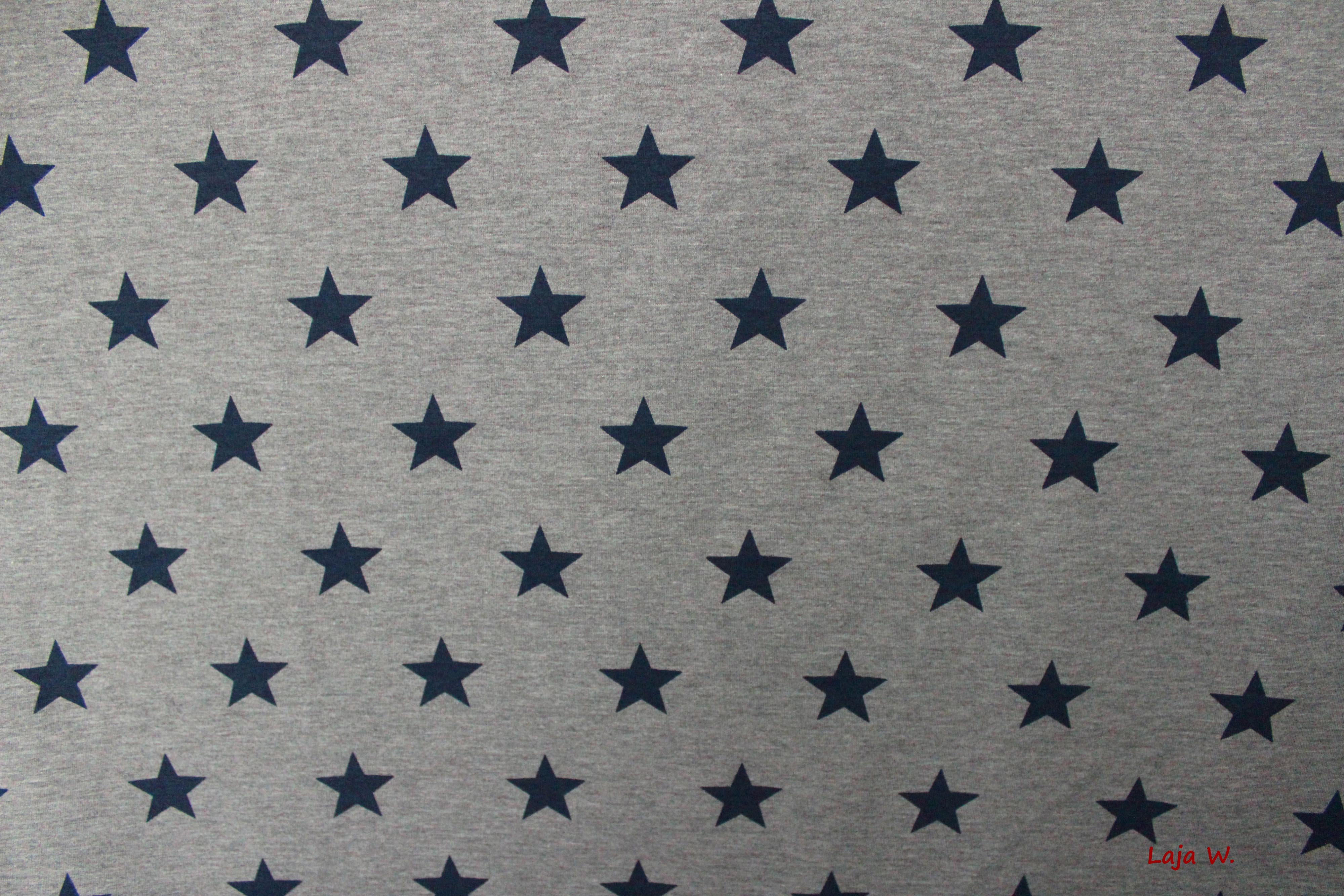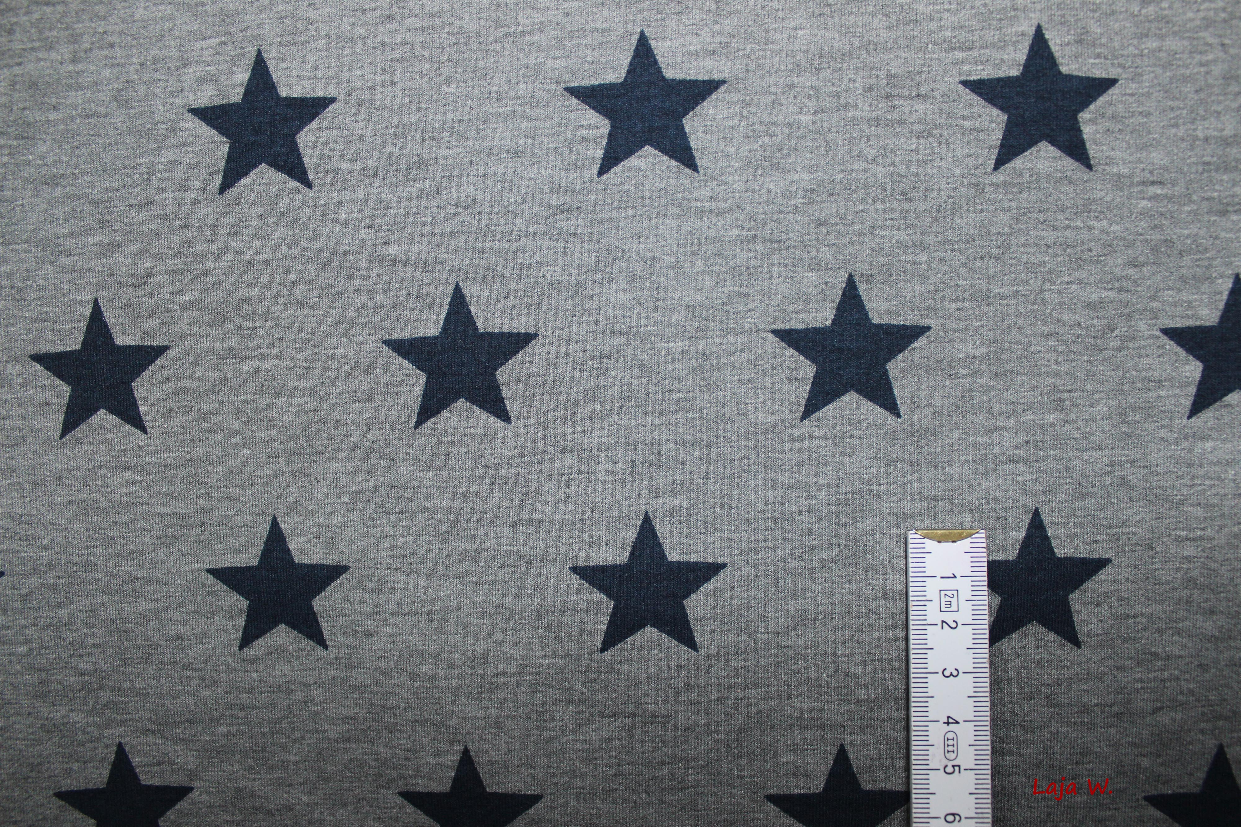 usw.Hier biete ich Euch einen absolut traumhaften dünnen Sommersweat in grau meliert mit dunkelblauen Sternen an. Die Rückseite des Sommersweates ist gewebt.