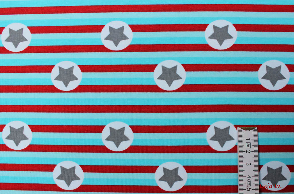 usw.Hier biete ich Euch einen absolut traumhaften Stretch-Jersey mit coolen Sternen auf rot, helltürkis und türkisfarbenen Streifen an. Ein absolutes Allroundtalent.