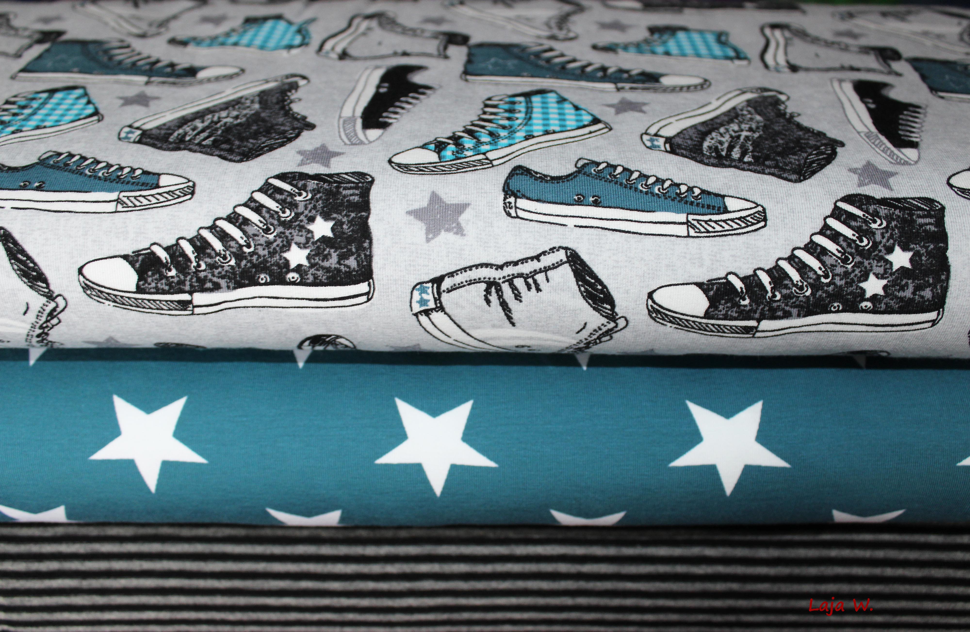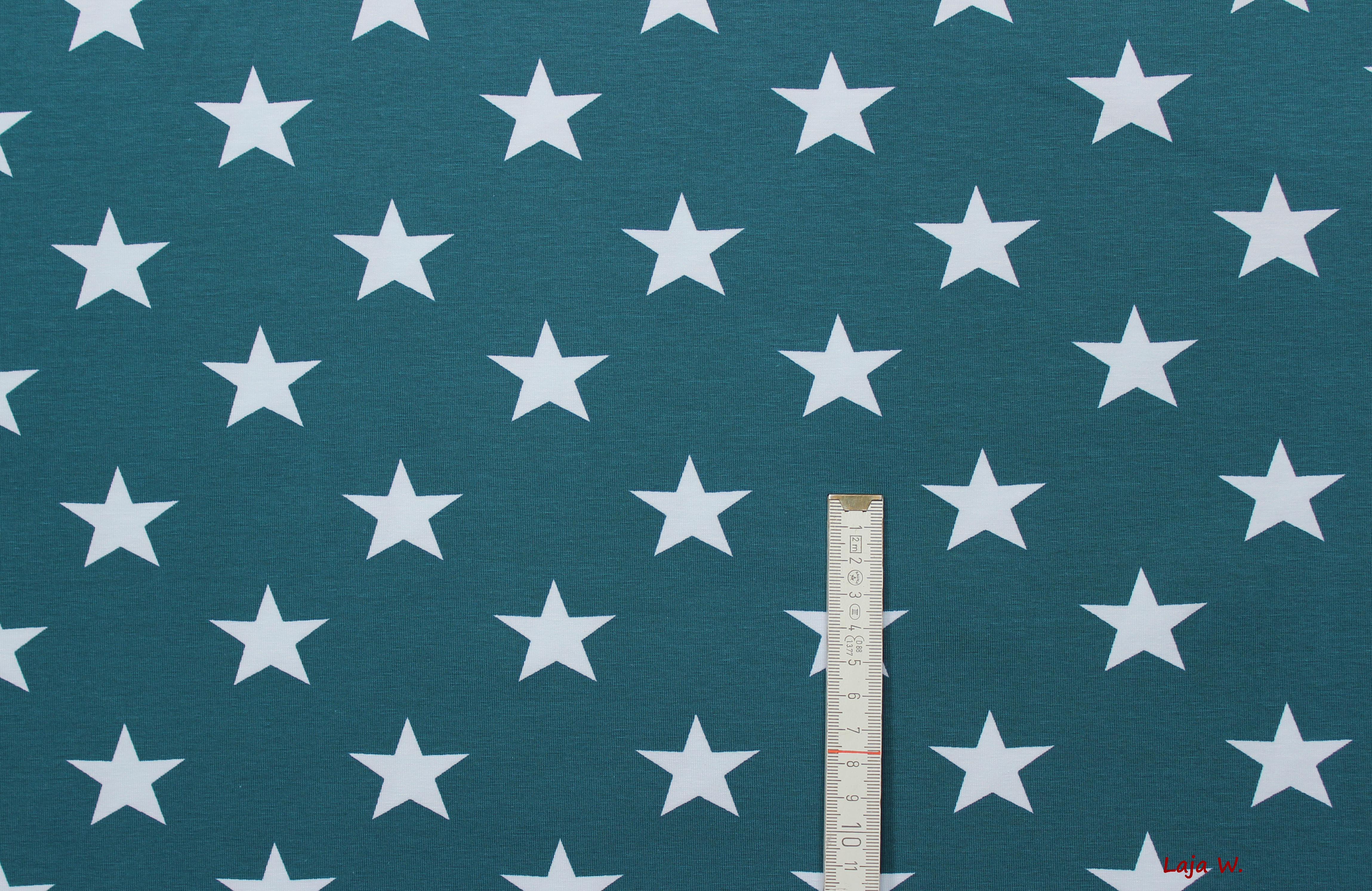 Hier biete ich Euch einen absolut traumhaften Stretch-Jersey mit vielen sternen in der Farbe petrol an. Daraus lassen sind coole Shirts für kleine und große Mädchen oder Jungs nähen. Die Sterne sind ca. 3,5 cm groß.