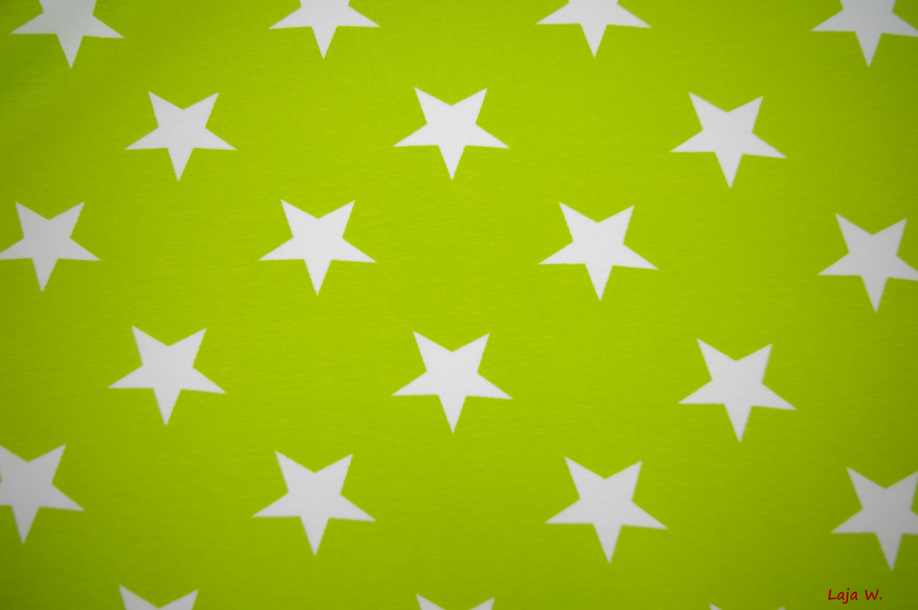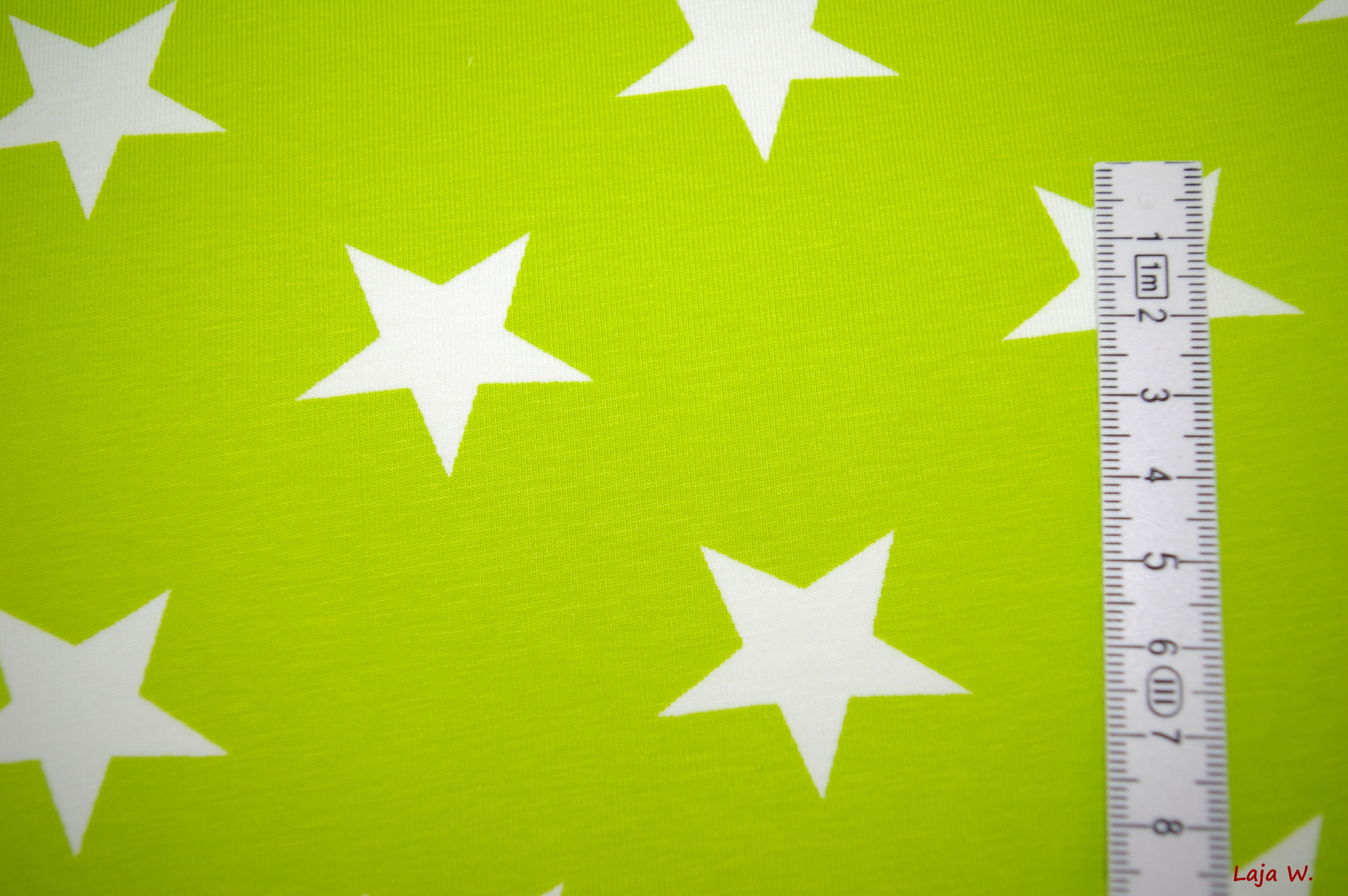 usw.Hier biete ich Euch einen absolut traumhaften Stretch-Jersey mit vielen sternen in der Farbe kiwi an. Daraus lassen sind coole Shirts für kleine und große Mädchen oder Jungs nähen. Die Sterne sind ca. 3,5 cm groß.