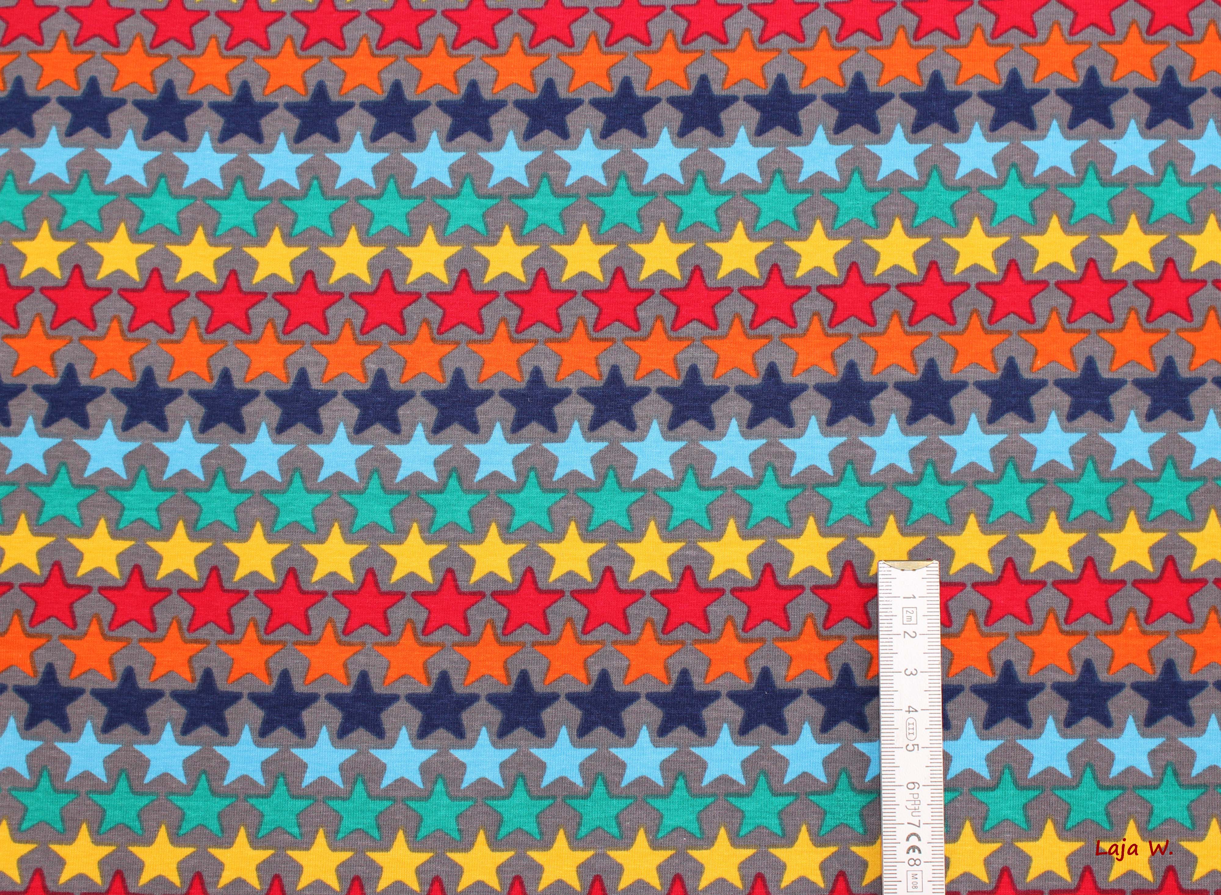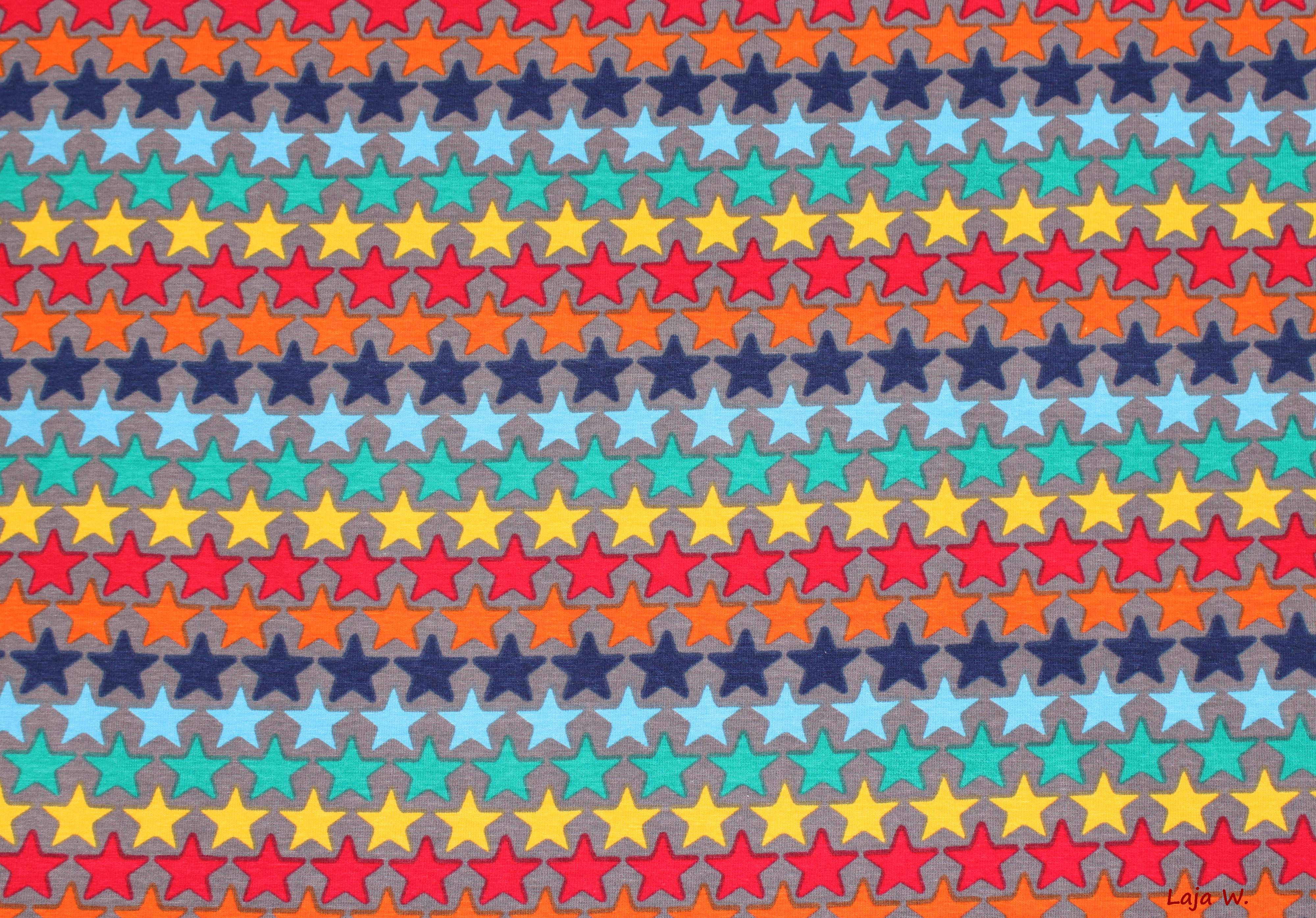 usw.Hier biete ich Euch einen Stretch-Jersey mit kunterbunten Sternen an.Der Untergrund ist grau.