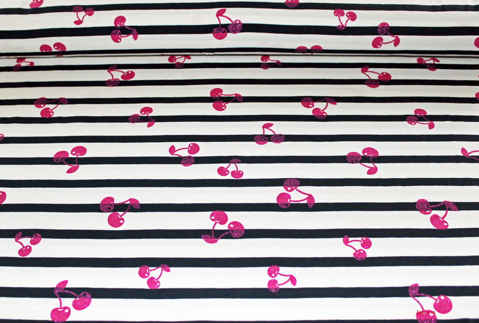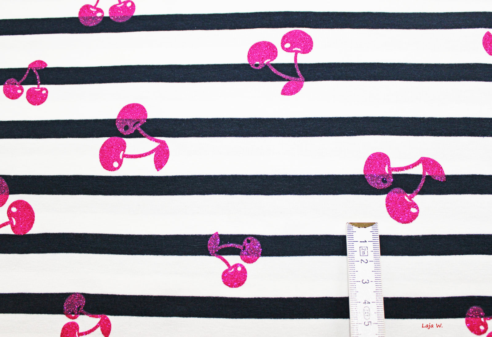 Wunderschöner leichterer Stretchjersey mit Glitzerkirschen in pink. Der Untergrund ist weiß und die Ringel dunkelblau.
