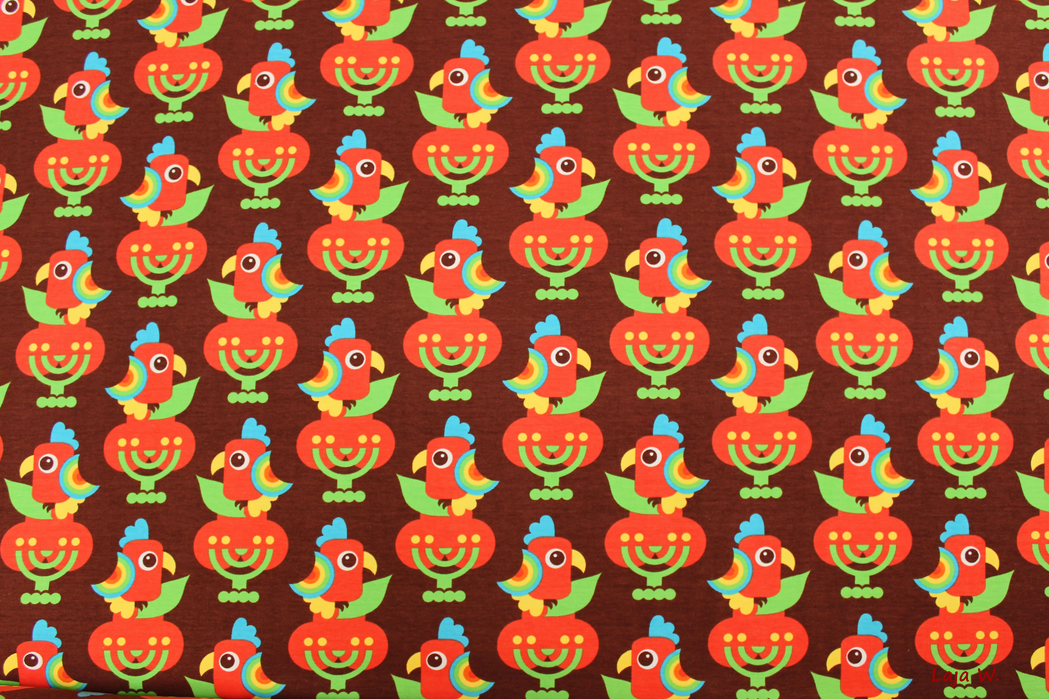 usw.Hier biete ich Euch einen absolut traumhaften Stretch-Jersey mit bunten Papageien nach dem Design von Sari Ahokainen an. Der Untergrund des Stoffes ist braun.