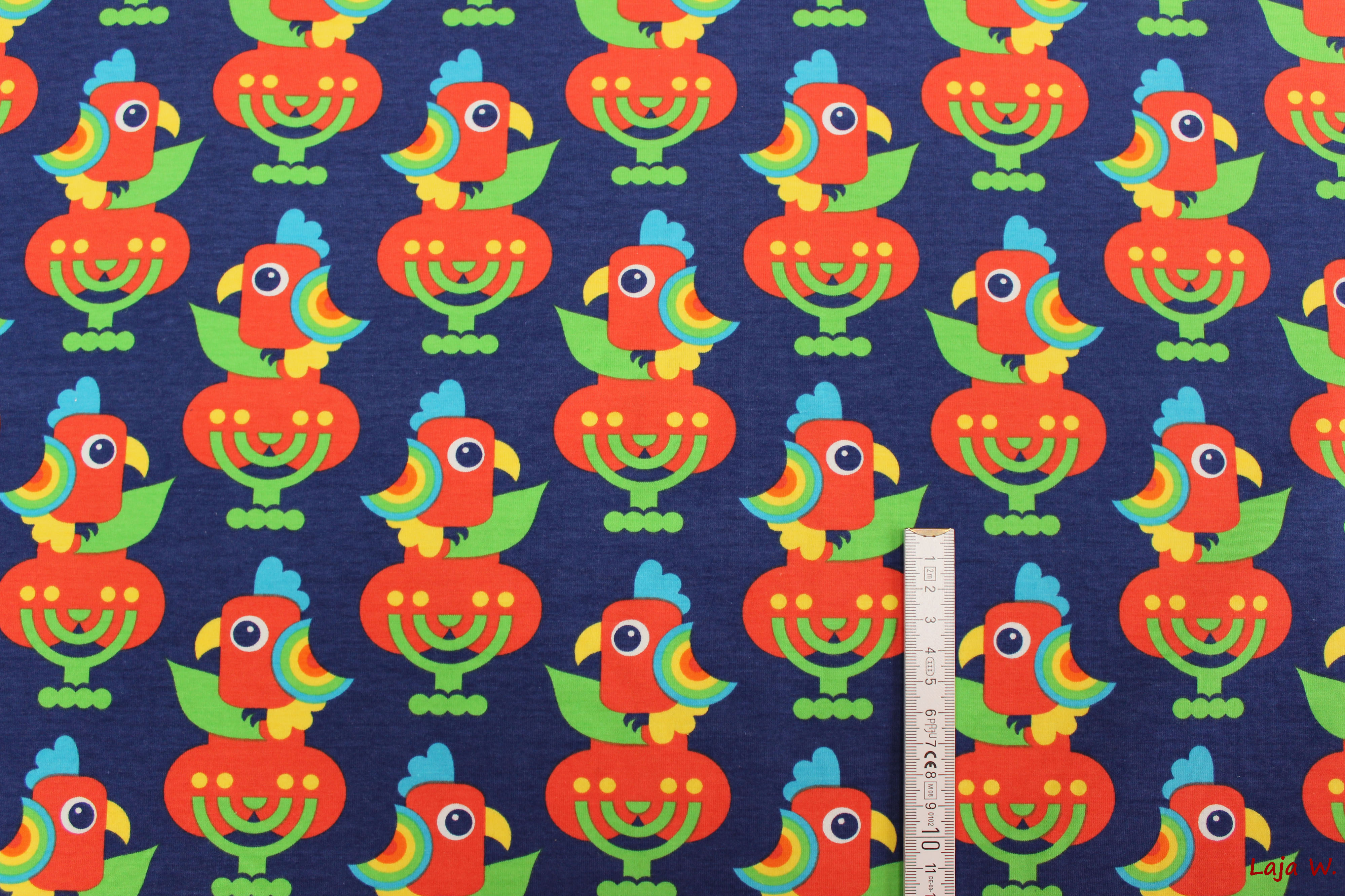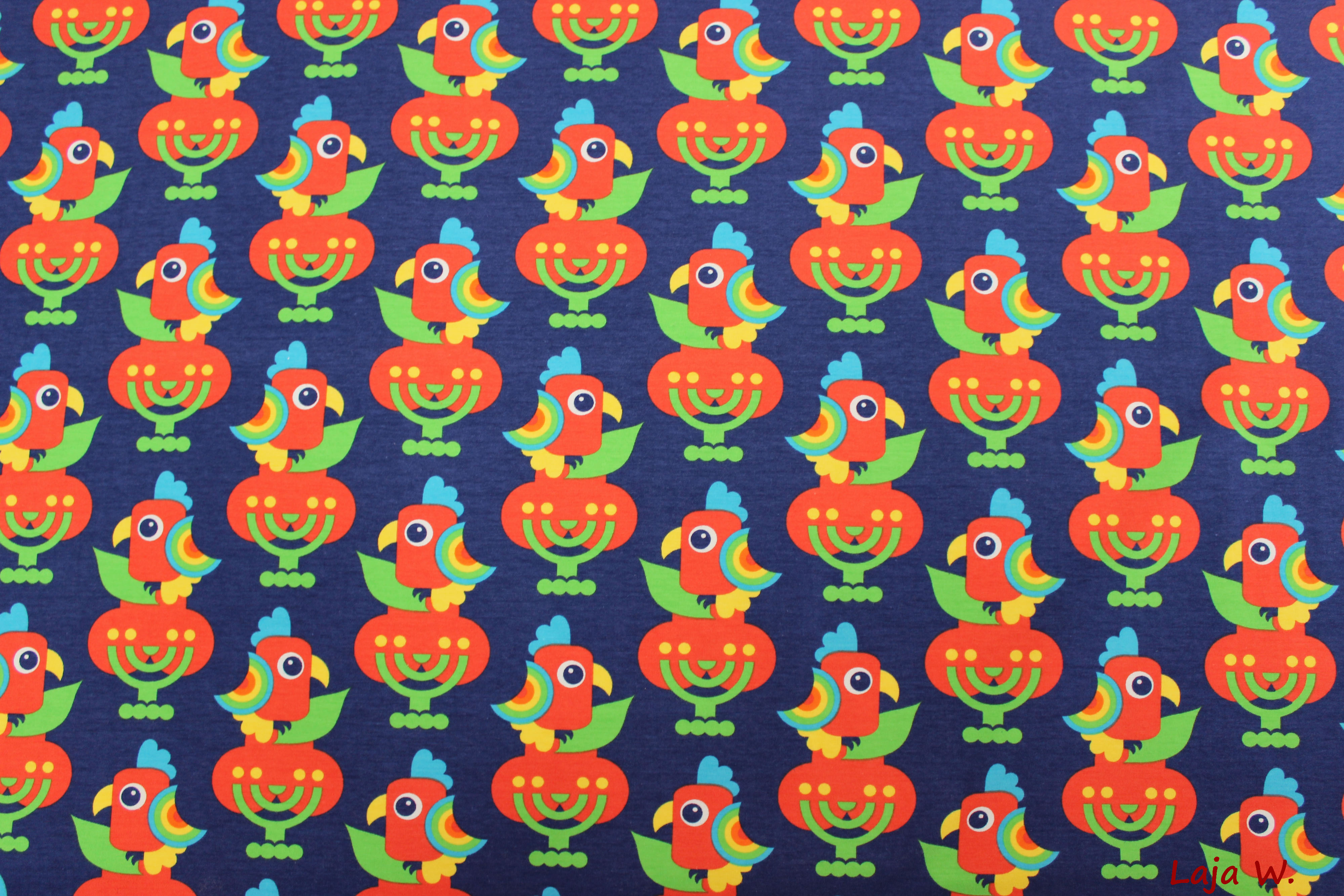 usw.Hier biete ich Euch einen absolut traumhaften Stretch-Jersey mit bunten Papageien nach dem Design von Sari Ahokainen an. Der Untergrund des Stoffes ist dunkelblau.