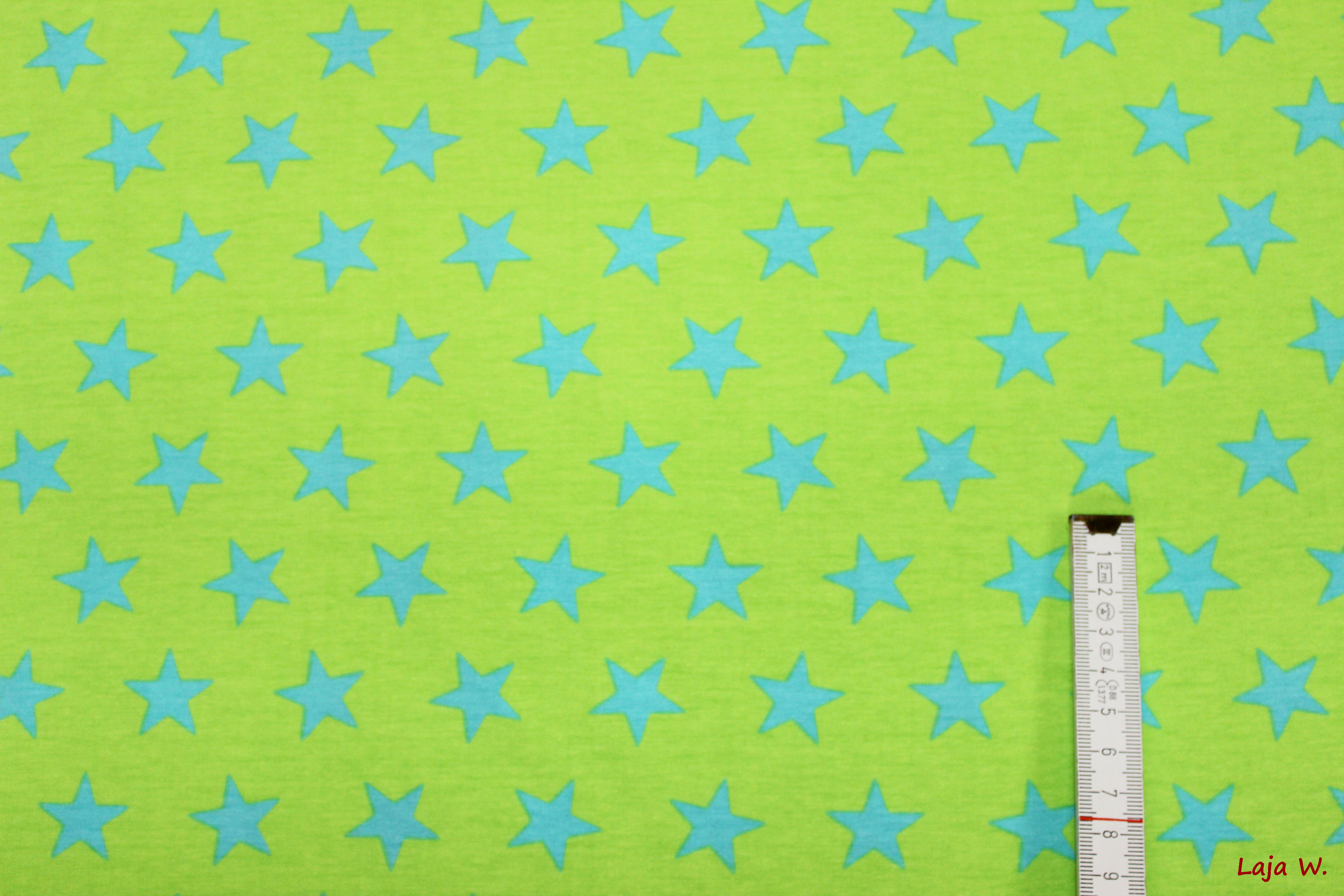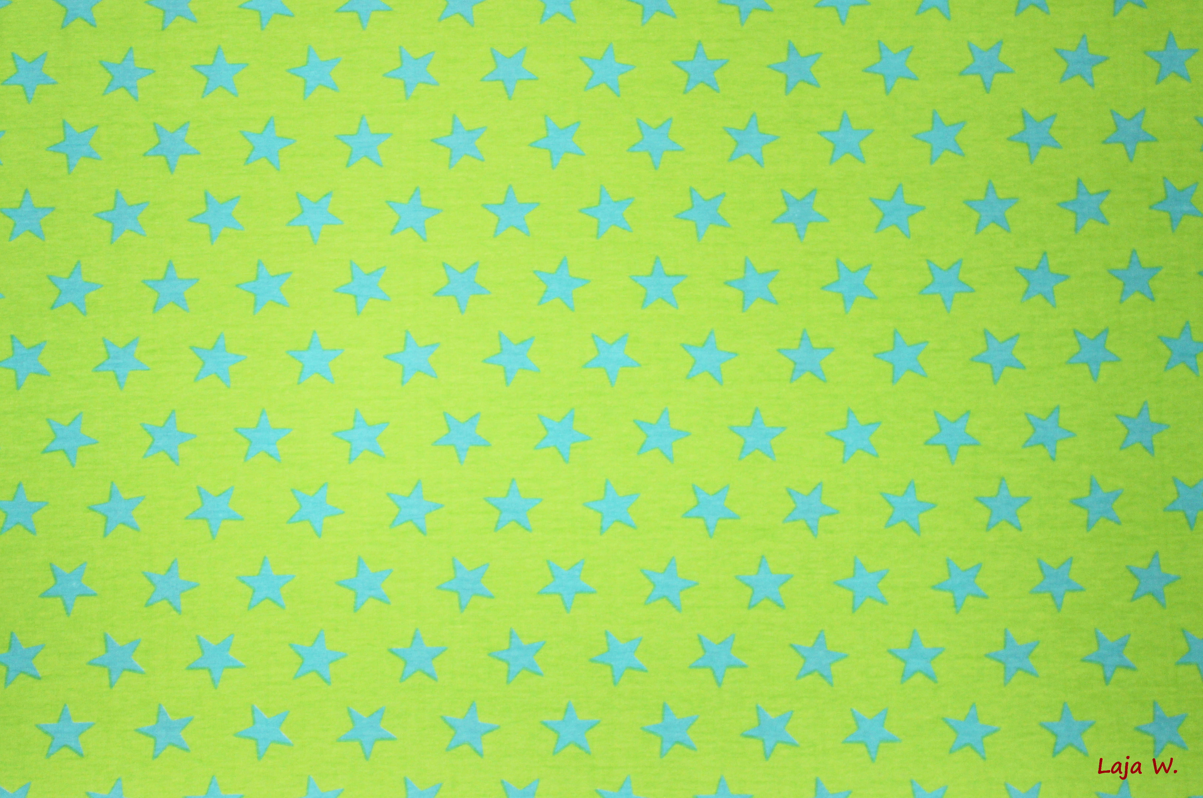 Endlich gibt es die beliebten Rollin' Stars auch als Stretch- Jersey. Hier biete ich Euch die Farbkombination helltürkise Sterne auf apfelgrünem Grund an.