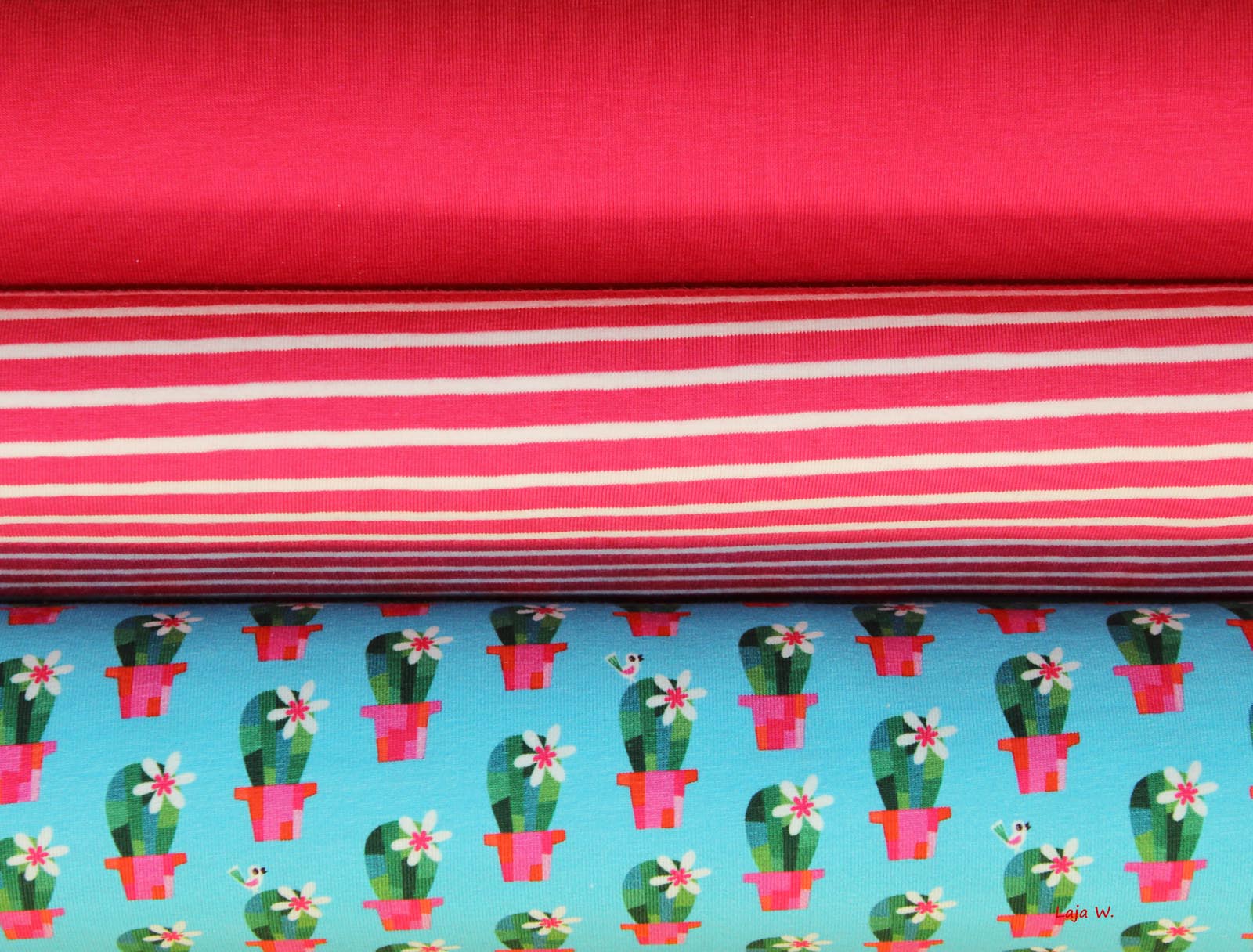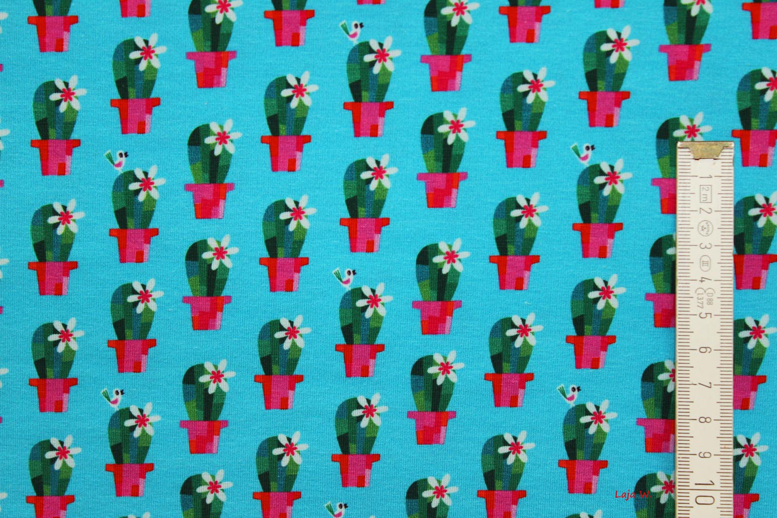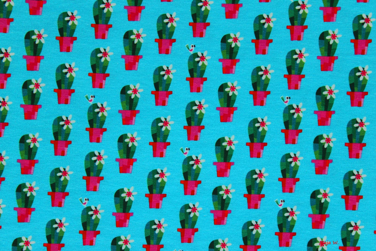 Hier biete ich Euch einen ausgefallenen Stretch-Jersey "Cactus Blossom" nach dem Design von Jolijou mit blühenden Kakteen auf türkisfarbenem Grund an. Daraus lassen sind coole Shirts oder andere Accessoires für kleine und große Mädchen nähen.
