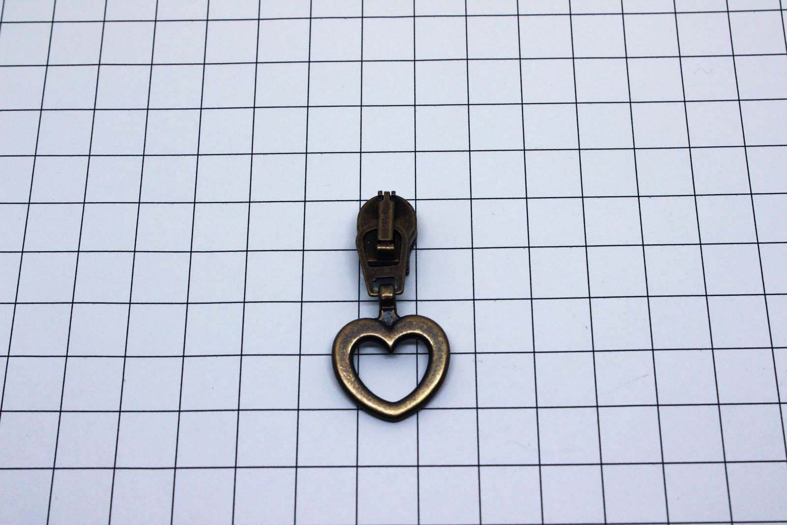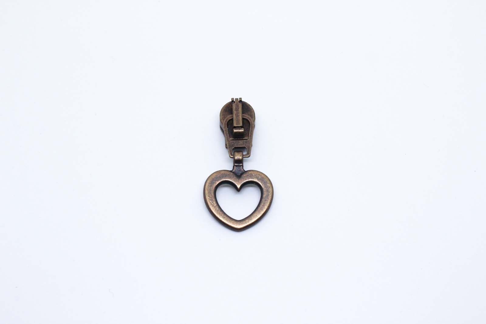 Zusätzlicher Automatikschieber am Zwischenglied mit Anhänger Herz messing-antik zu unserer Meterware "Reißverschluss metallisiert breit"
