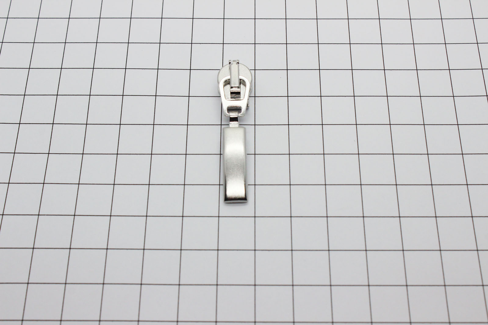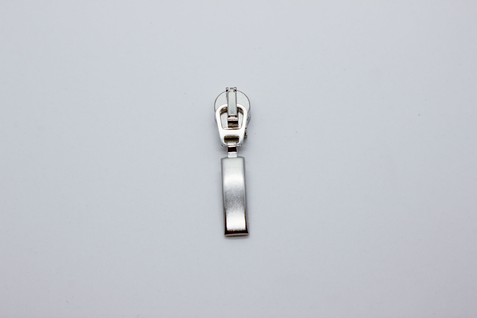 Zusätzlicher Automatikschieber mit Bogen groß am Zwischenglied silber zu unserer Meterware "Reißverschluss metallisiert breit"