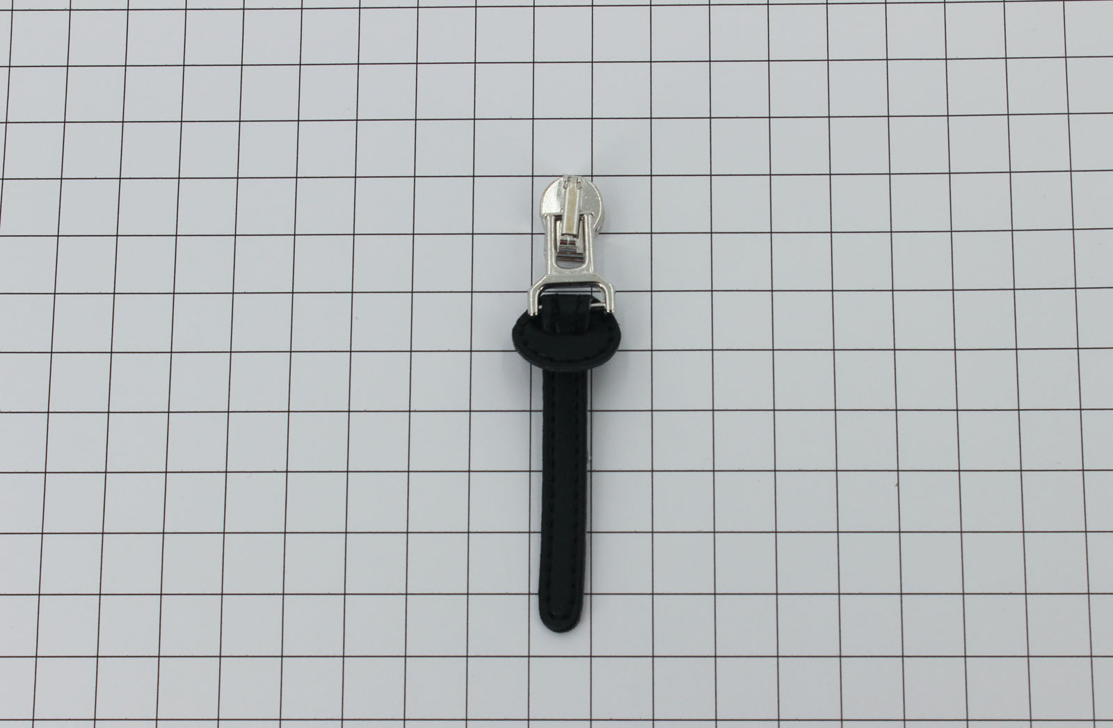 Zusätzlicher Automatikschieber mit Kunstlederanhänger am Zwischenglied silber/schwarz zu unserer Meterware "Reißverschluss metallisiert breit"