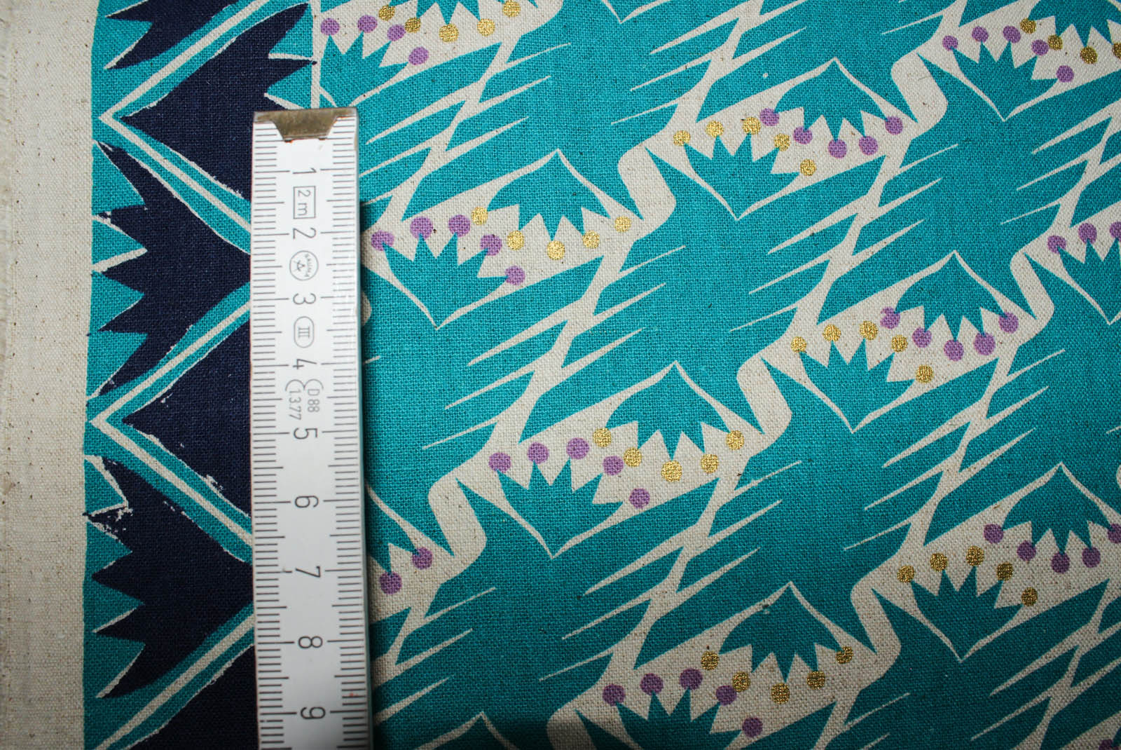 Baumwoll/ Leinengemisch by Yurtao aus dem Hause Kokka in petrol/dunkelblau/ lila und gold mit schmaler doppelseitiger Bordüre . Dieser etwas festere Stoff aus Leinen-/ Baumwolle ist ganz außergewöhnlich und eignet sich super für Taschen und Accessoires. Durch die grobere Baumwoll/ Leinenzusammensetzung gibt es bei allen diesen Kokka- Leinengemischen technisch bedingt ab und zu kleine unbedruckte Punkte (Stellen). Dies unterstreicht den bekannt-lässigen Charakter der Kokka- Stoffe, ich möchte es aber trotzdem erwähnt haben.