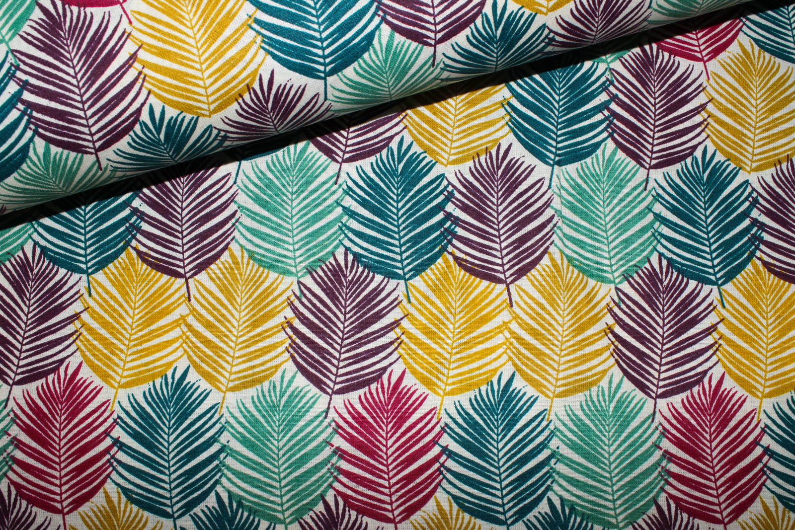 Baumwollwebware mit Blättern, ideal geeignet für Taschen, Rucksäcke, Geldbörsen und Accessoires. Der Untergrund des Stoffes ist naturweiß. Der Stoff ist dünn aber etwas fester von der Haptik.
