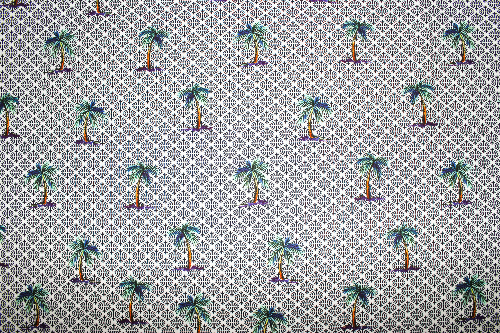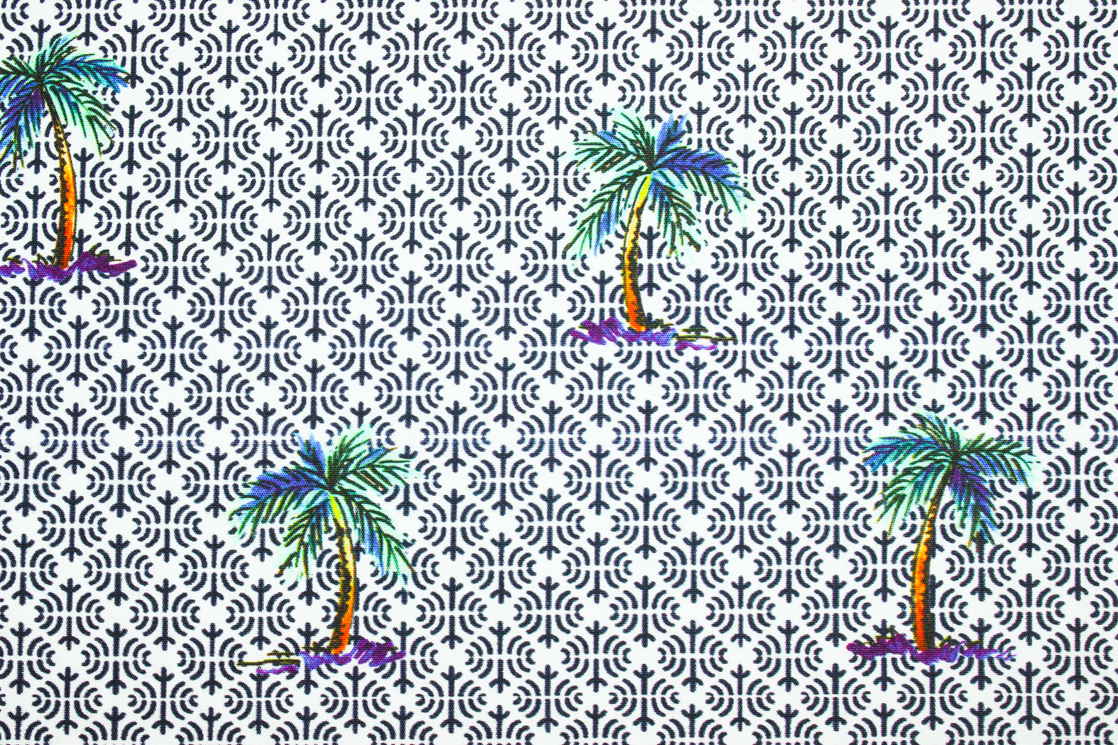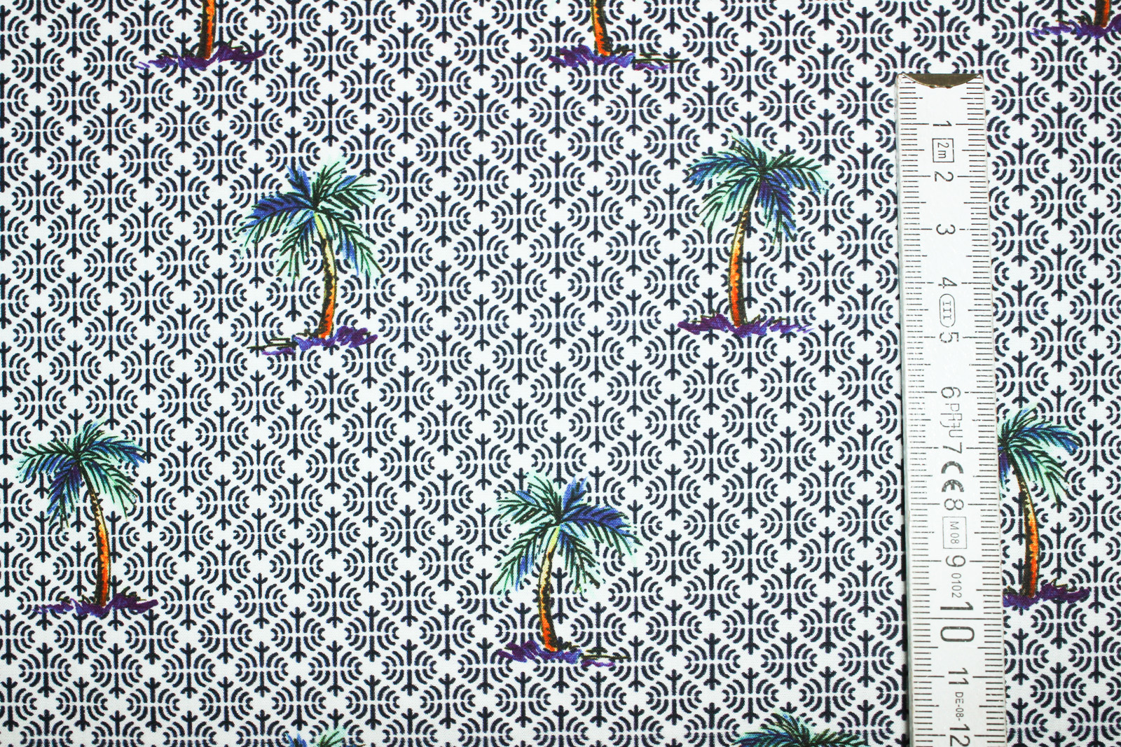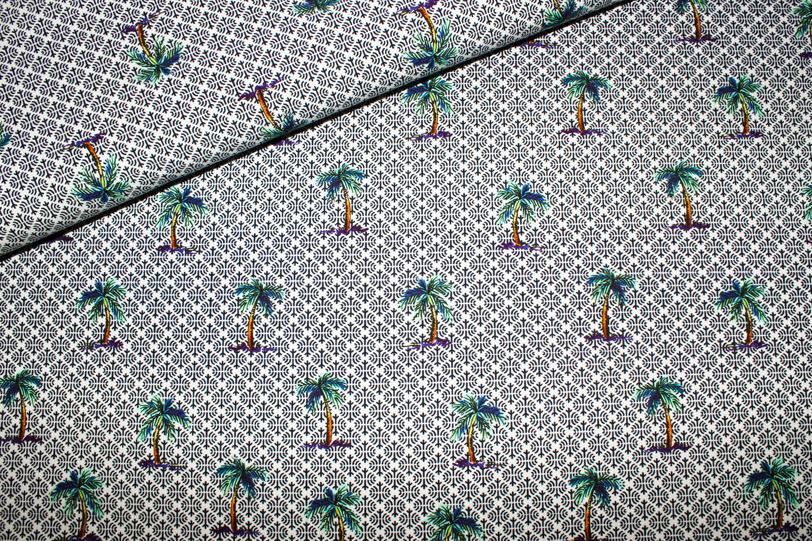 Hier biete ich Euch einen absolut hochwertigen, sommerlichen Baumwollstoff der Firma Hilco mit digitalem Palmen-Druck auf gemusterten Untergrund (weiß/ navy) an.Die Palmen haben eine Größe von ca. 4 cm.