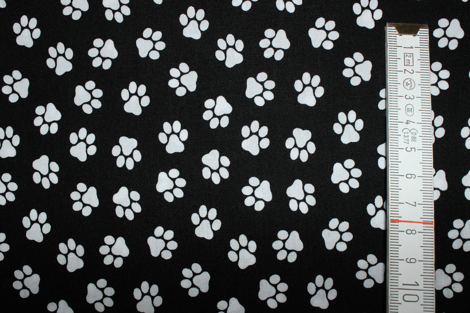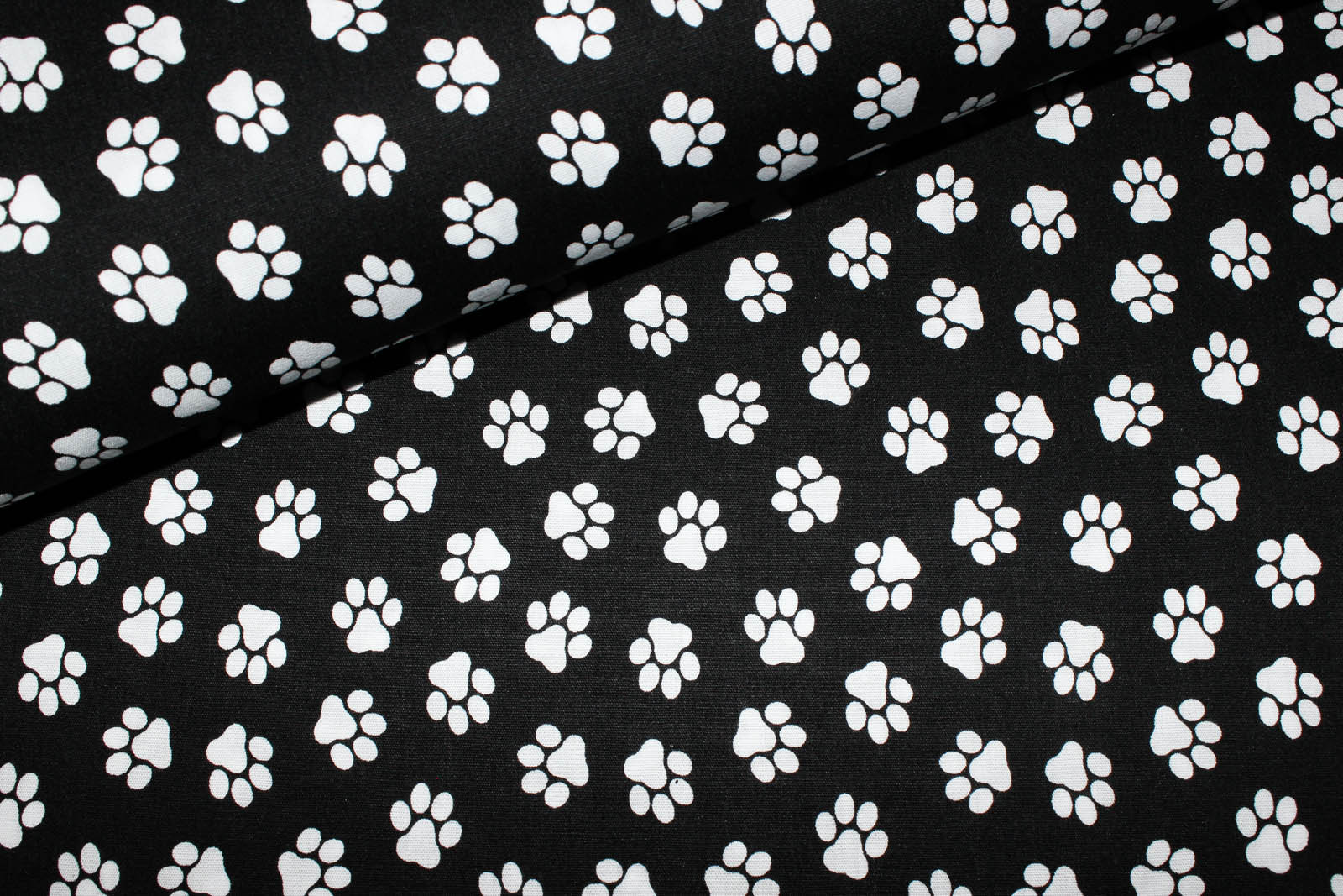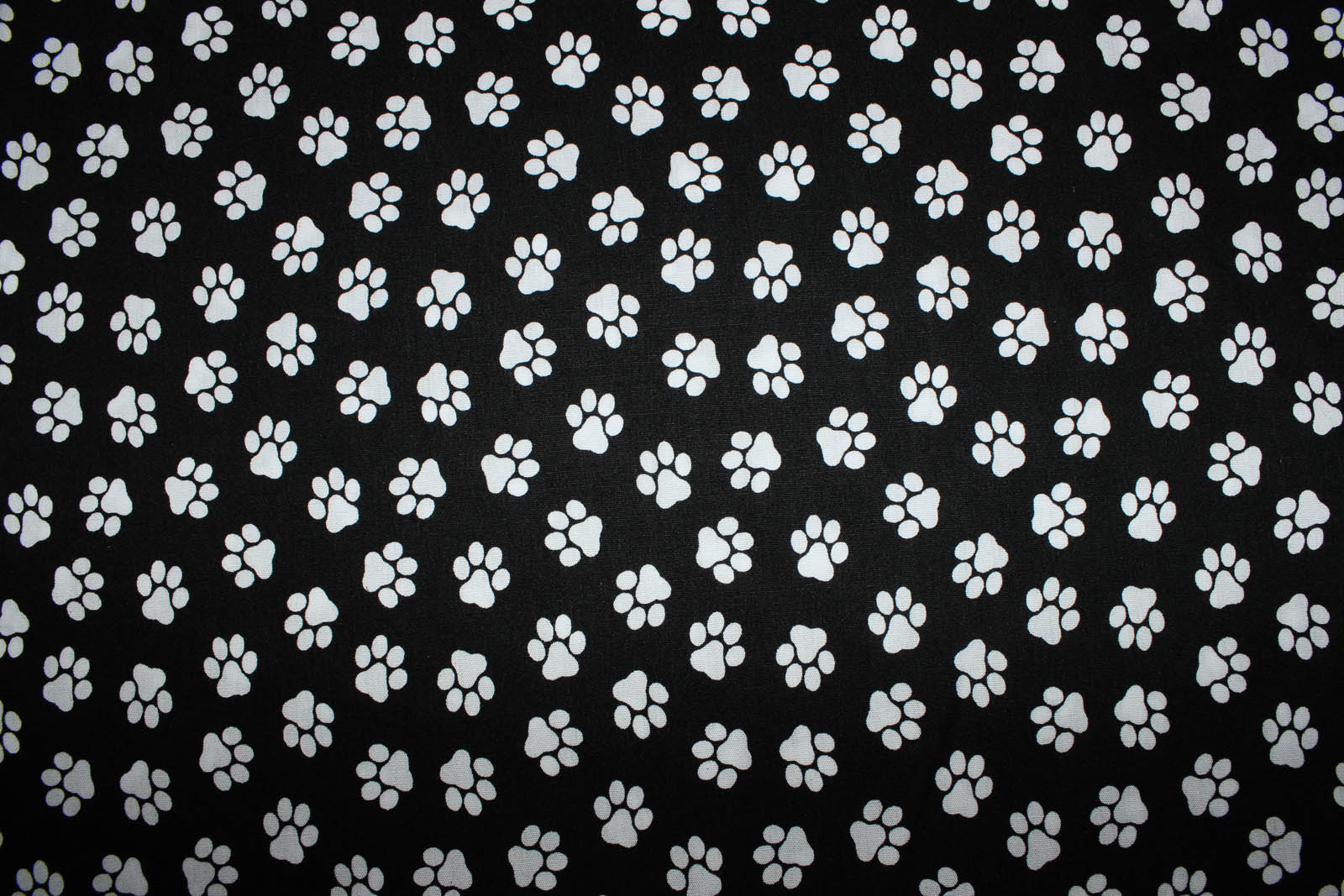 Baumwollwebstoff mit weißen Pfötchen auf schwarzem Untergrund für Bekleidung, Taschen, Accessoires uvm. Die Pfötchen haben eine Größe von ca. 1,5 cm x 1,5 cm.