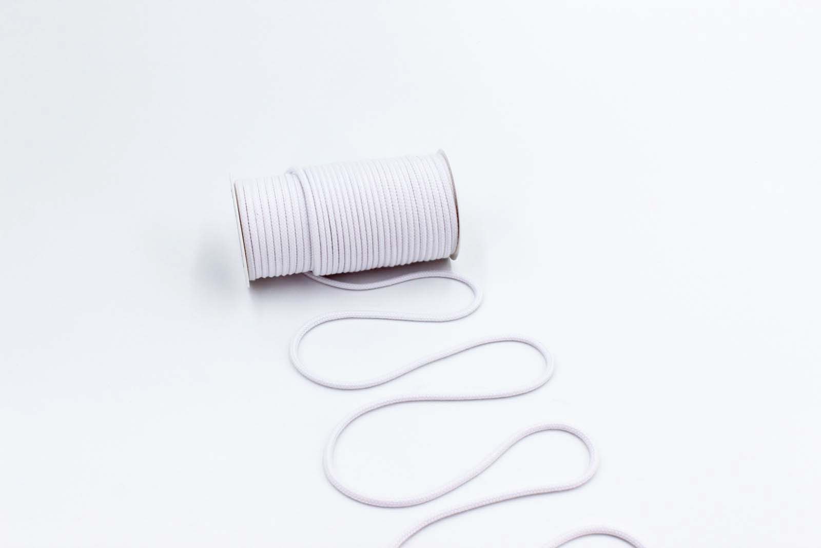 Hochwertige schmalere Baumwollkordel reinweiß für Hoodies, Turnbeutel o.ä. Das achtfach geflochtene Band aus 100 % Baumwolle ist ca. 6 mm dick und gibt bei Zug leicht nach. Die Kordel ist geschmeidig und stabil.- Zusammensetzung: 100 % Baumwolle