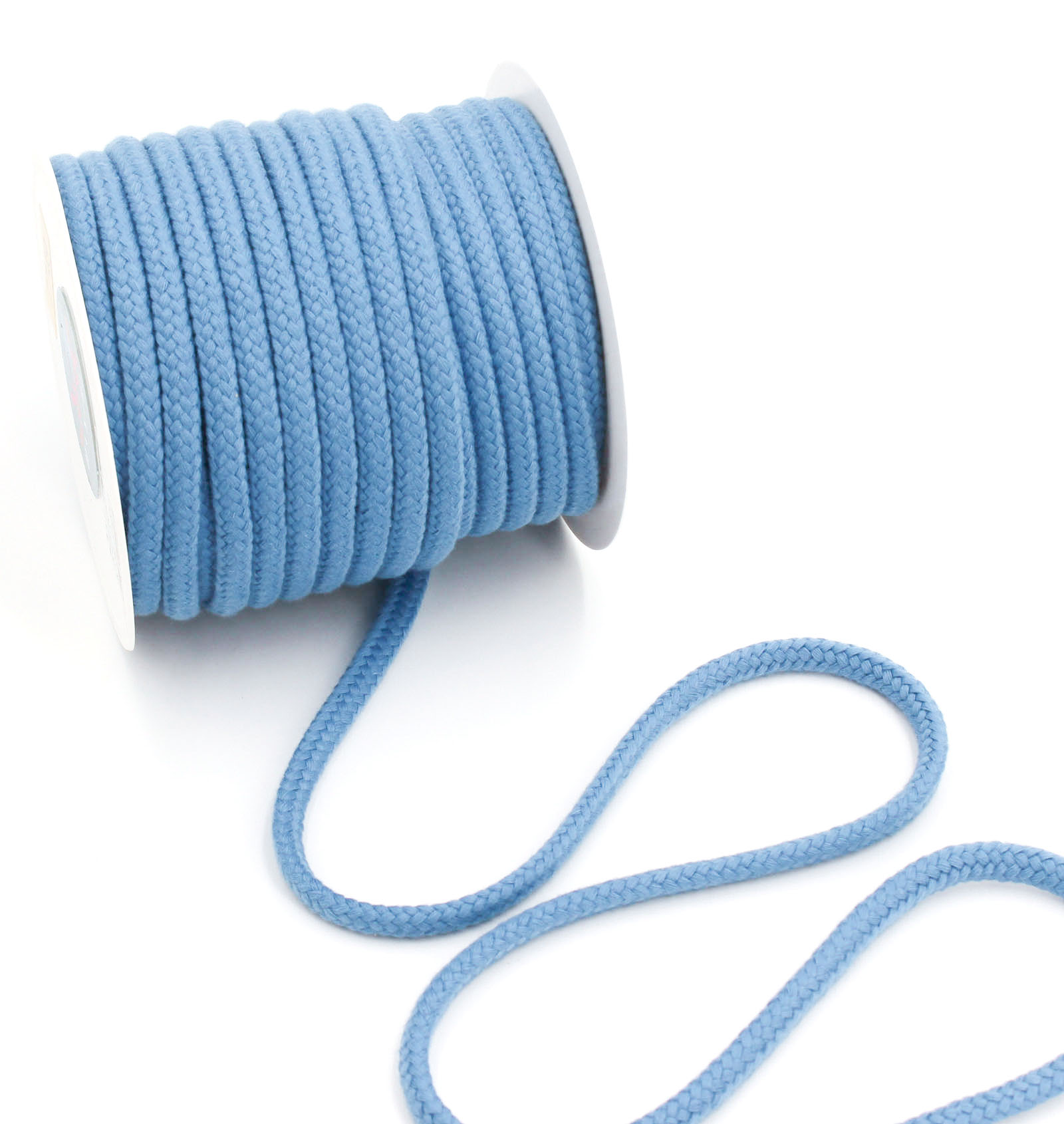 Hochwertige Baumwollkordel azurblau für Hoodies, Turnbeutel o.ä. Das achtfach geflochtene Band aus 100 % Baumwolle ist ca. 9 mm dick und gibt bei Zug leicht nach. Die Kordel ist geschmeidig und stabil.- Zusammensetzung: 100 % Baumwolle