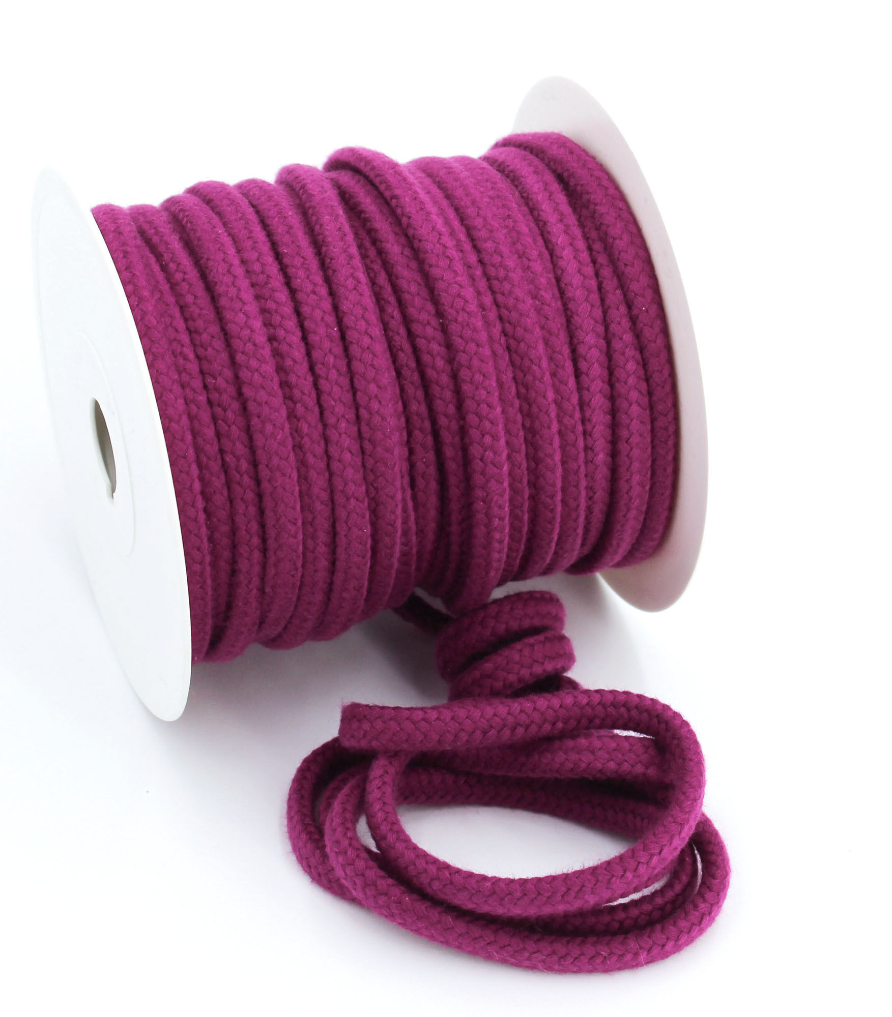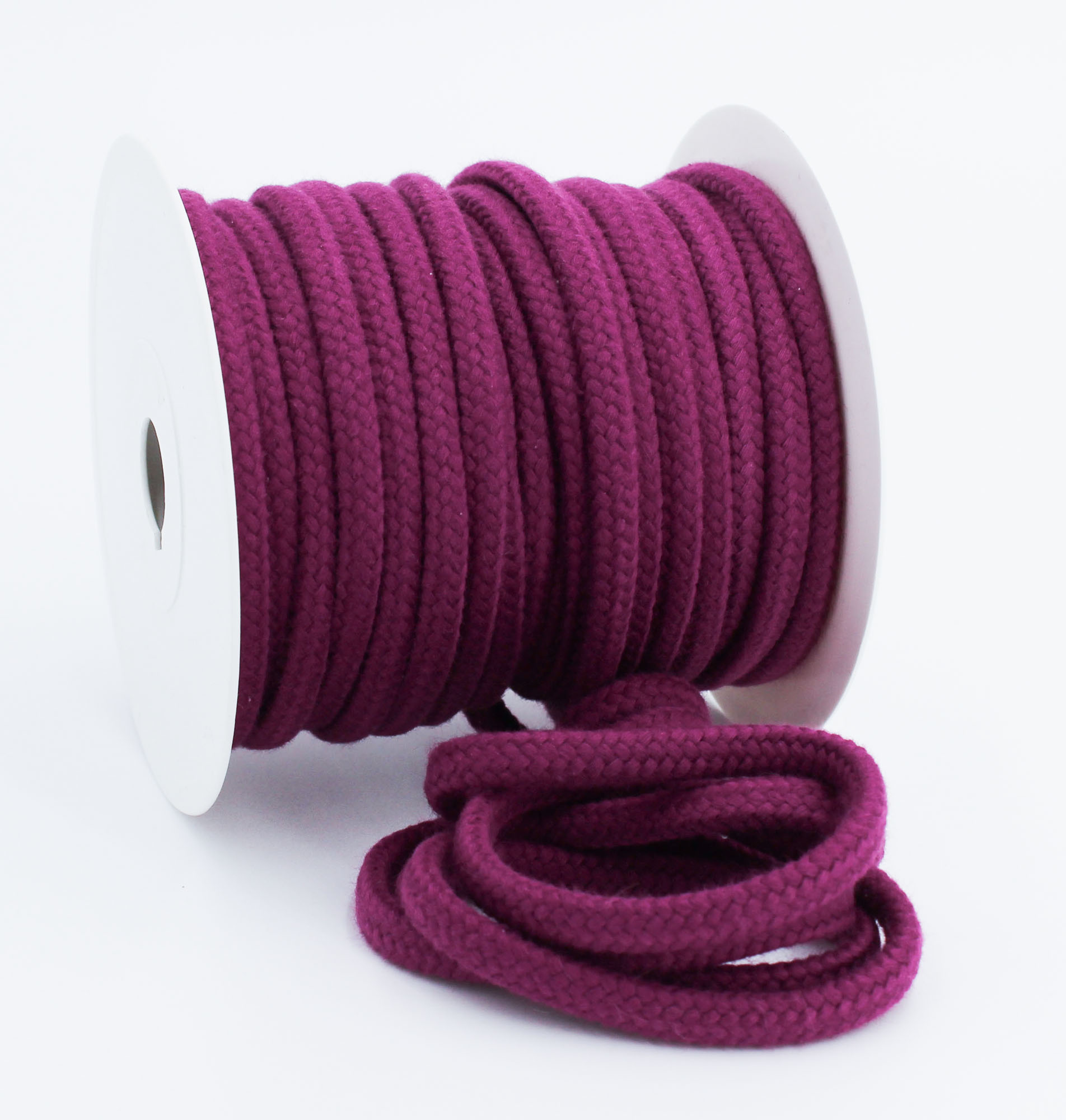 Hochwertige Baumwollkordel lila für Hoodies, Turnbeutel o.ä. Das achtfach geflochtene Band aus 100 % Baumwolle ist ca. 9 mm dick und gibt bei Zug leicht nach. Die Kordel ist geschmeidig und stabil.