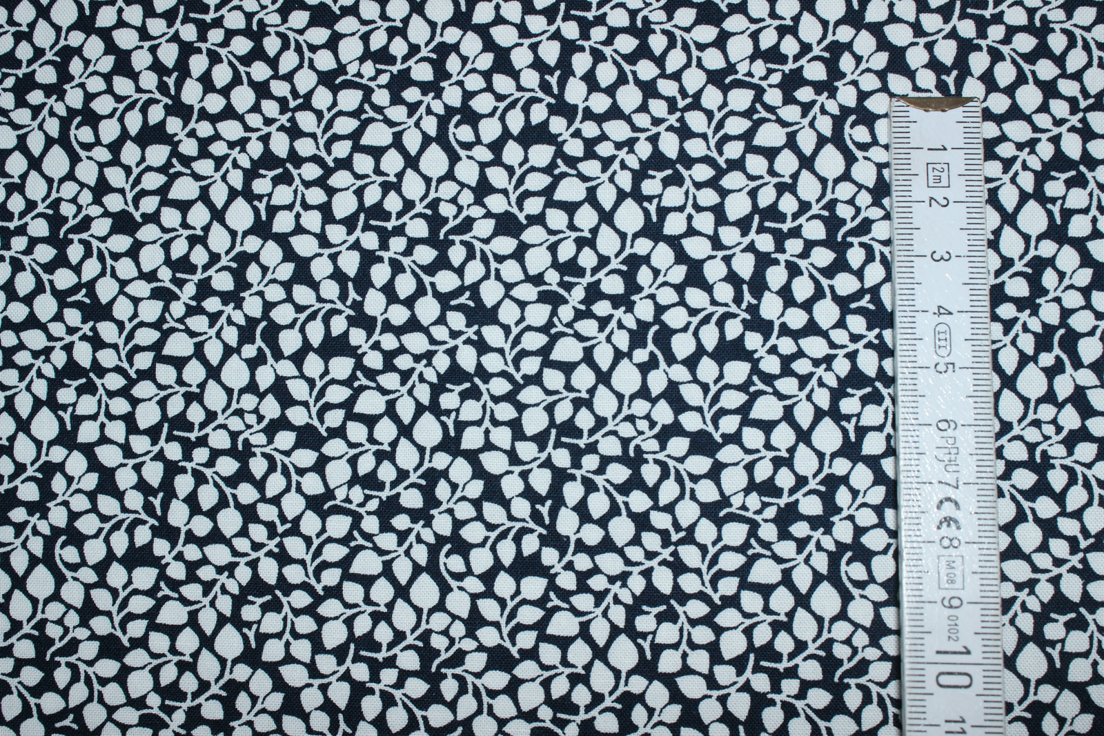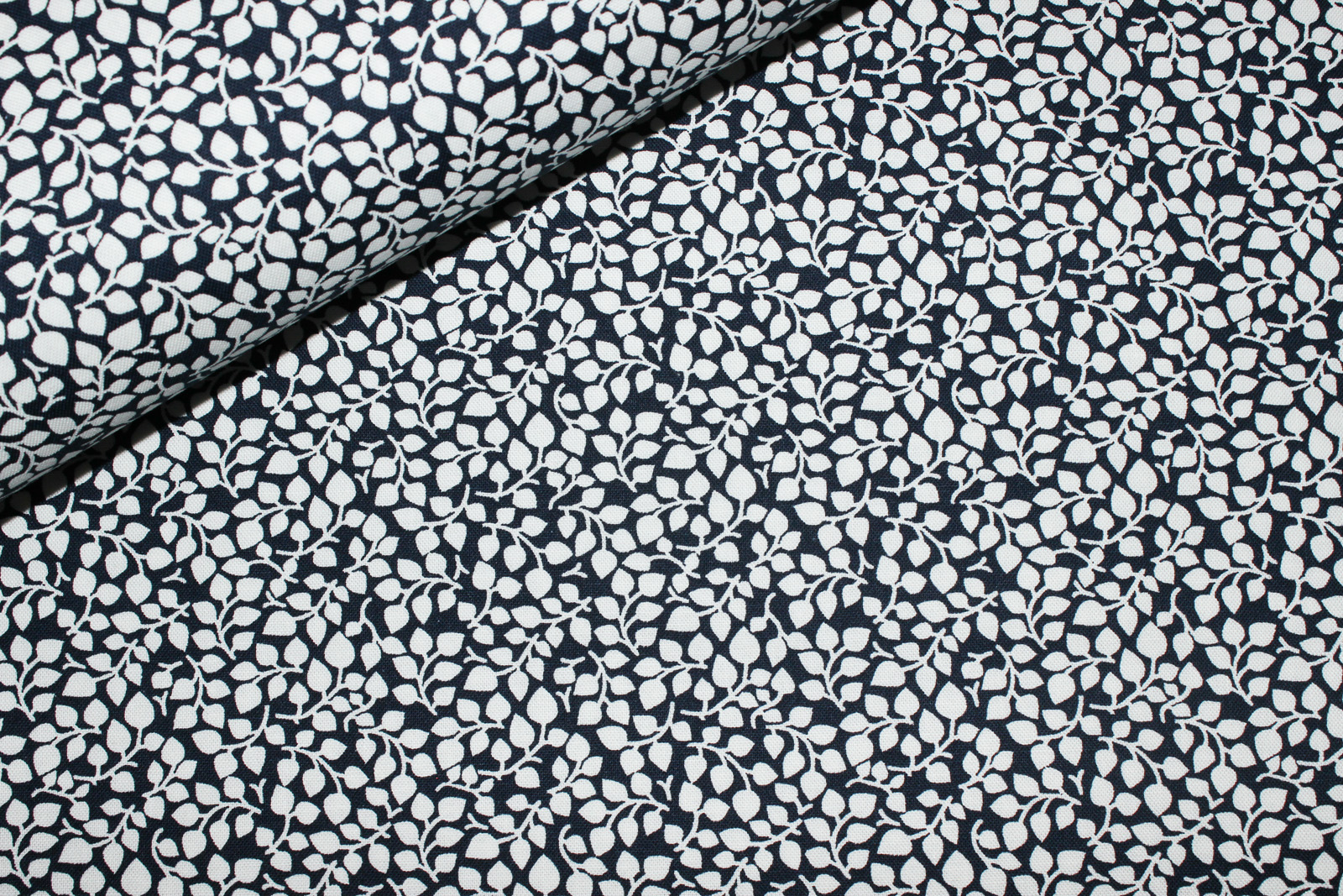 Schöner, nicht zu dünner Baumwollwebstoff mit weißen Blätterranken auf dunkelblauem Untergrund. Perfekt für Taschen, Rucksäcke, Kissen aber auch Bekleidung.