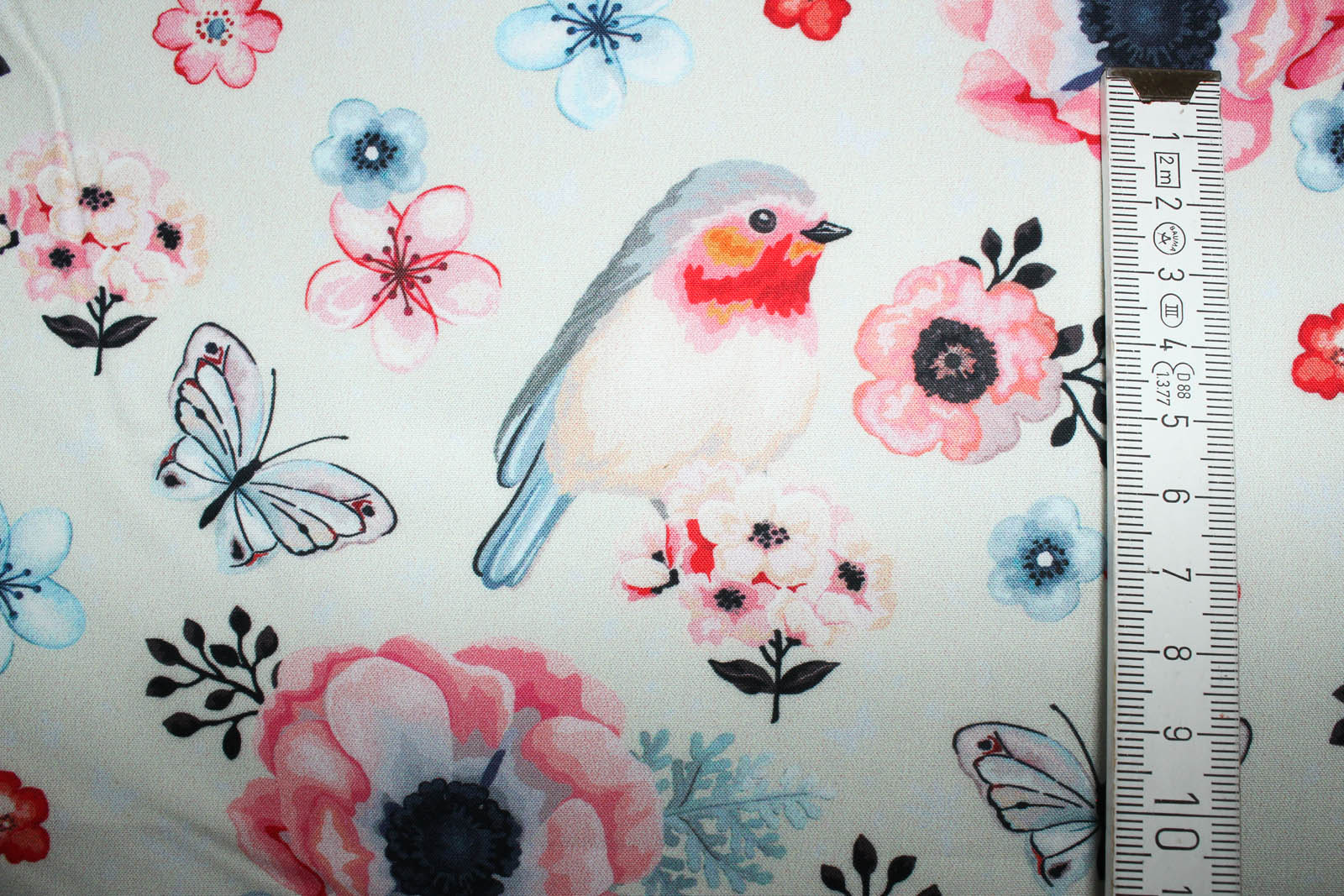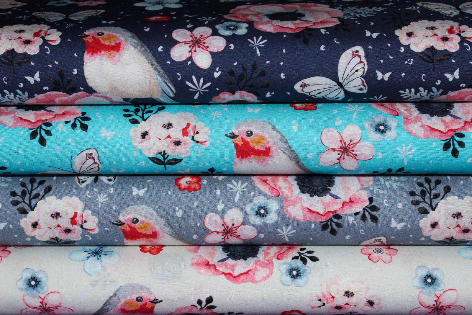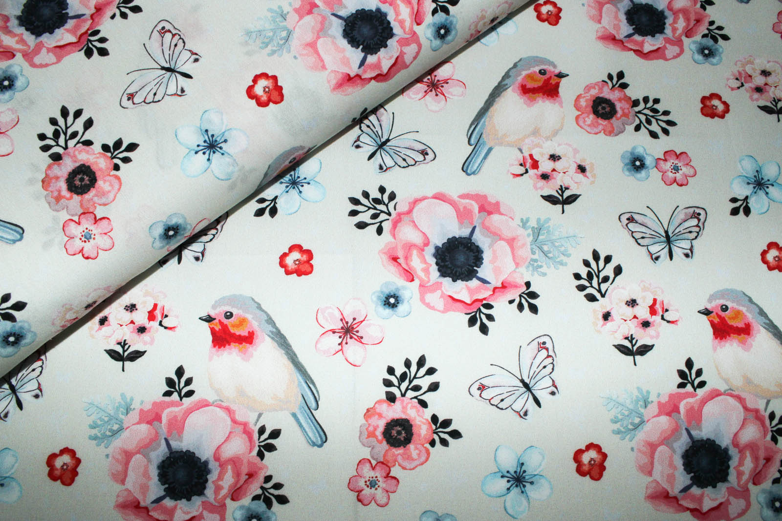 Schöner Baumwollwebstoff in creme mit Rotkehlchen, Blumen und Schmetterlingen. Die Rotkehlchen haben eine Größe von ca. 6,5 cm. Die weiteren Stoffe auf dem vierten Foto gehören nicht zu diesem Angebot. Diese dienen der Inspiration.