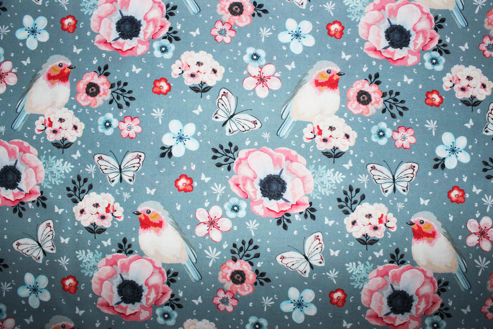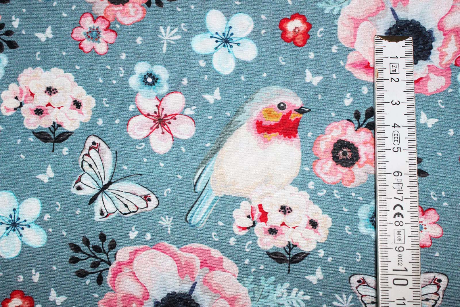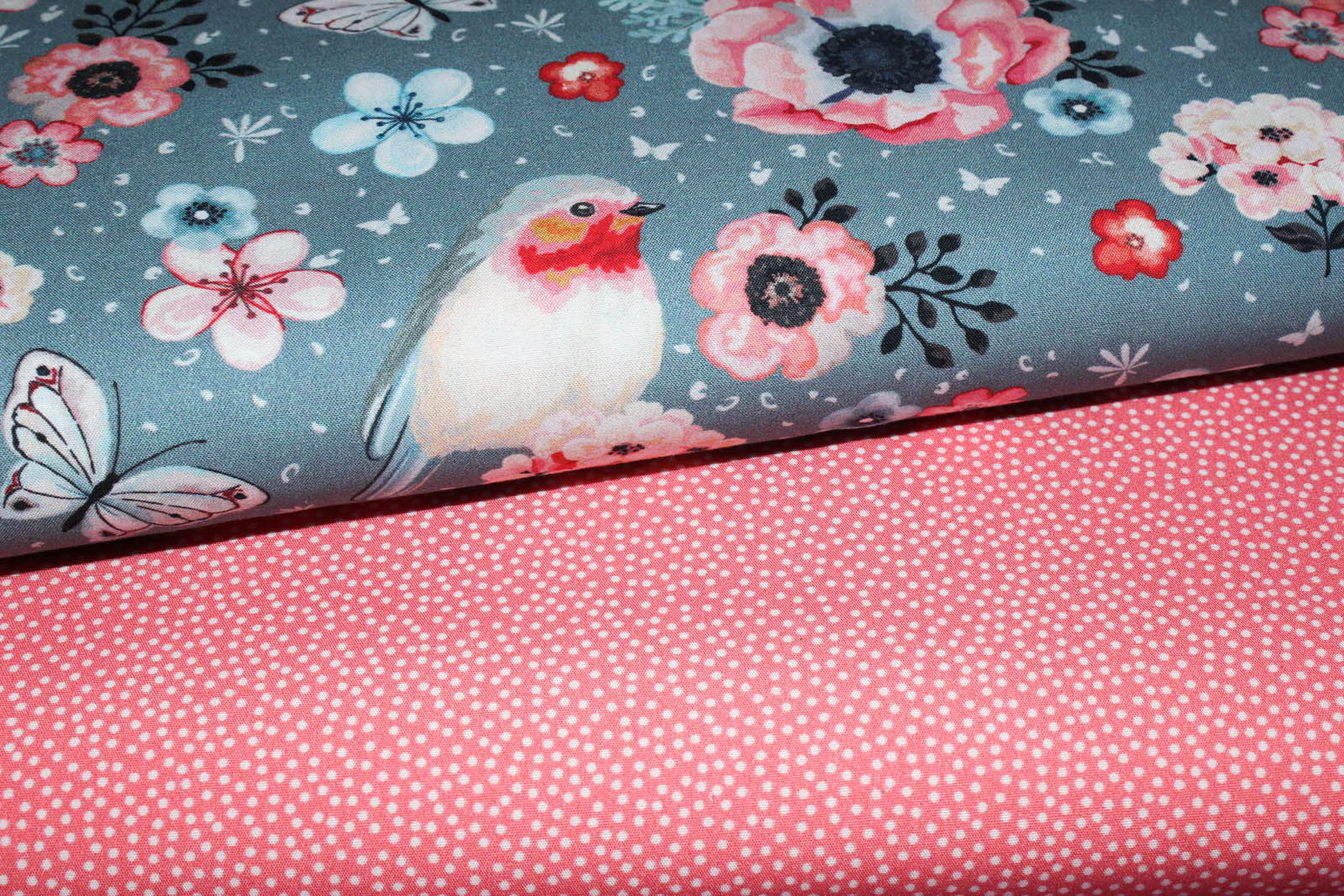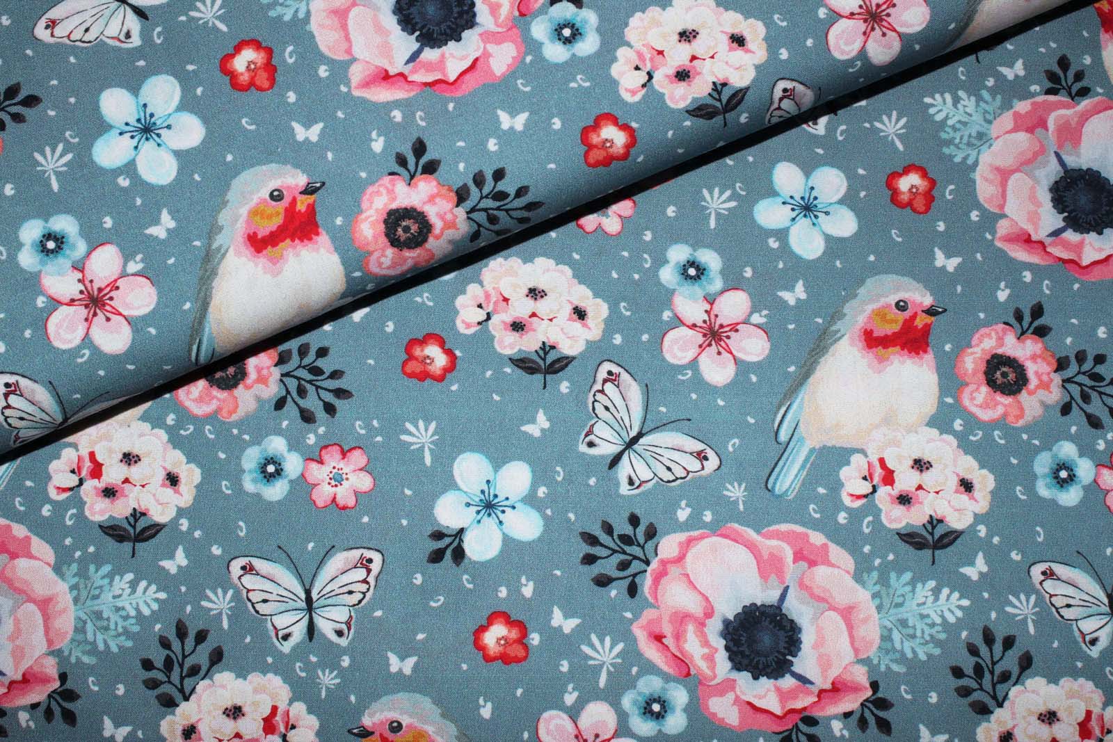 Schöner Baumwollwebstoff in grau mit Rotkehlchen, Blumen und Schmetterlingen. Die Rotkehlchen haben eine Größe von ca. 6,5 cm. Die weiteren Stoffe auf dem vierten Foto gehören nicht zu diesem Angebot. Diese dienen der Inspiration.