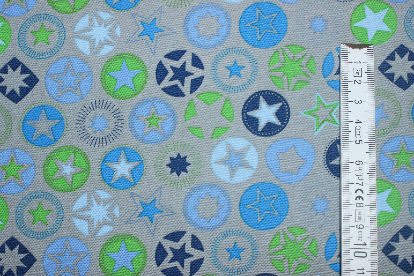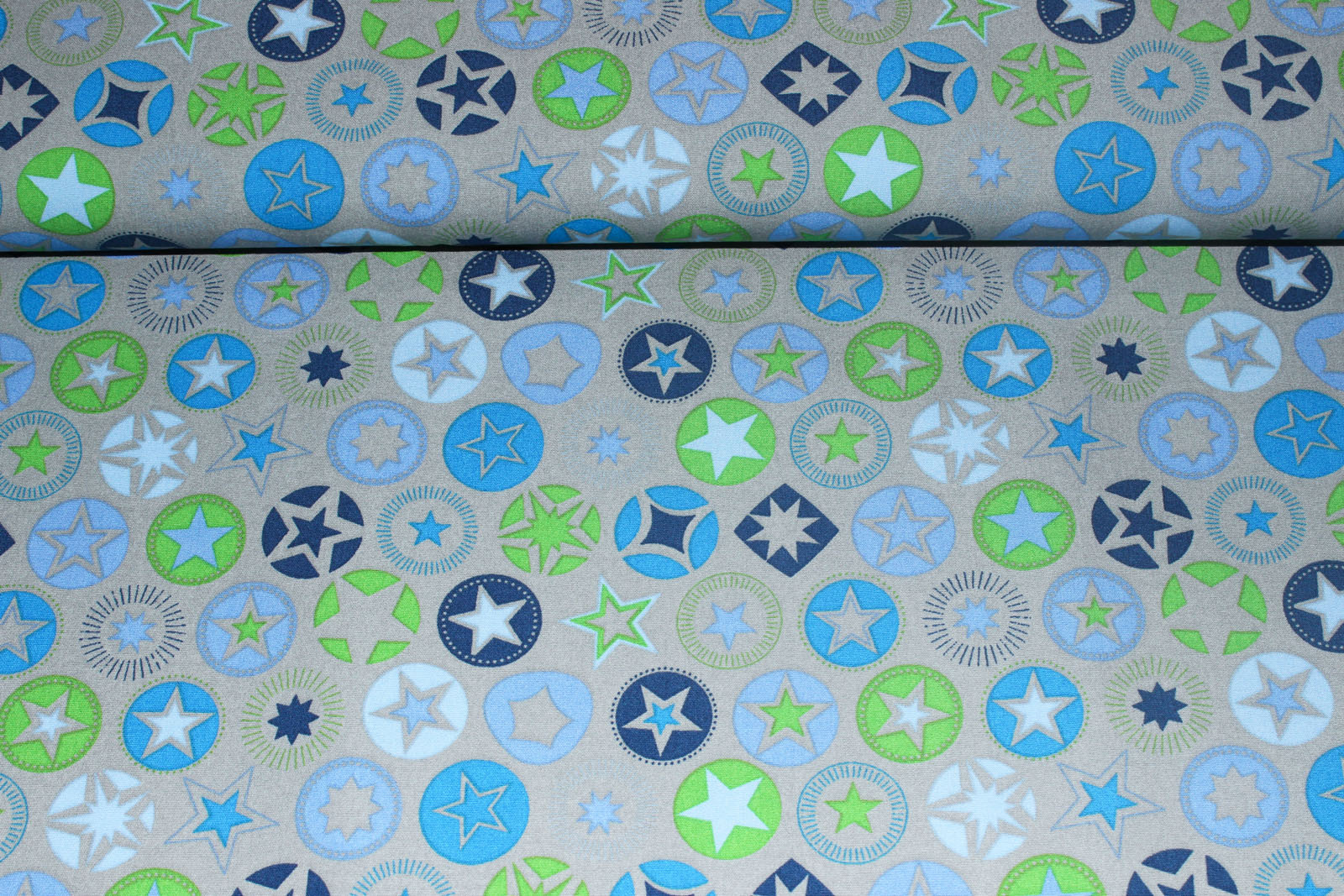 Schöner jungstauglicher Baumwollstoff mit blauen und grünen Sternen auf grauem Untergrund. Ideal geeignet für Hemden, Hosen, Kissen und Accessoires.