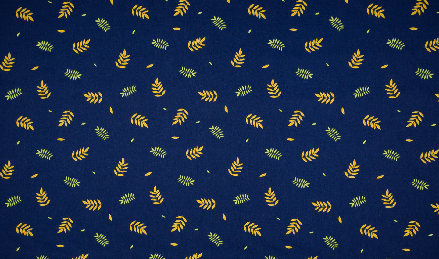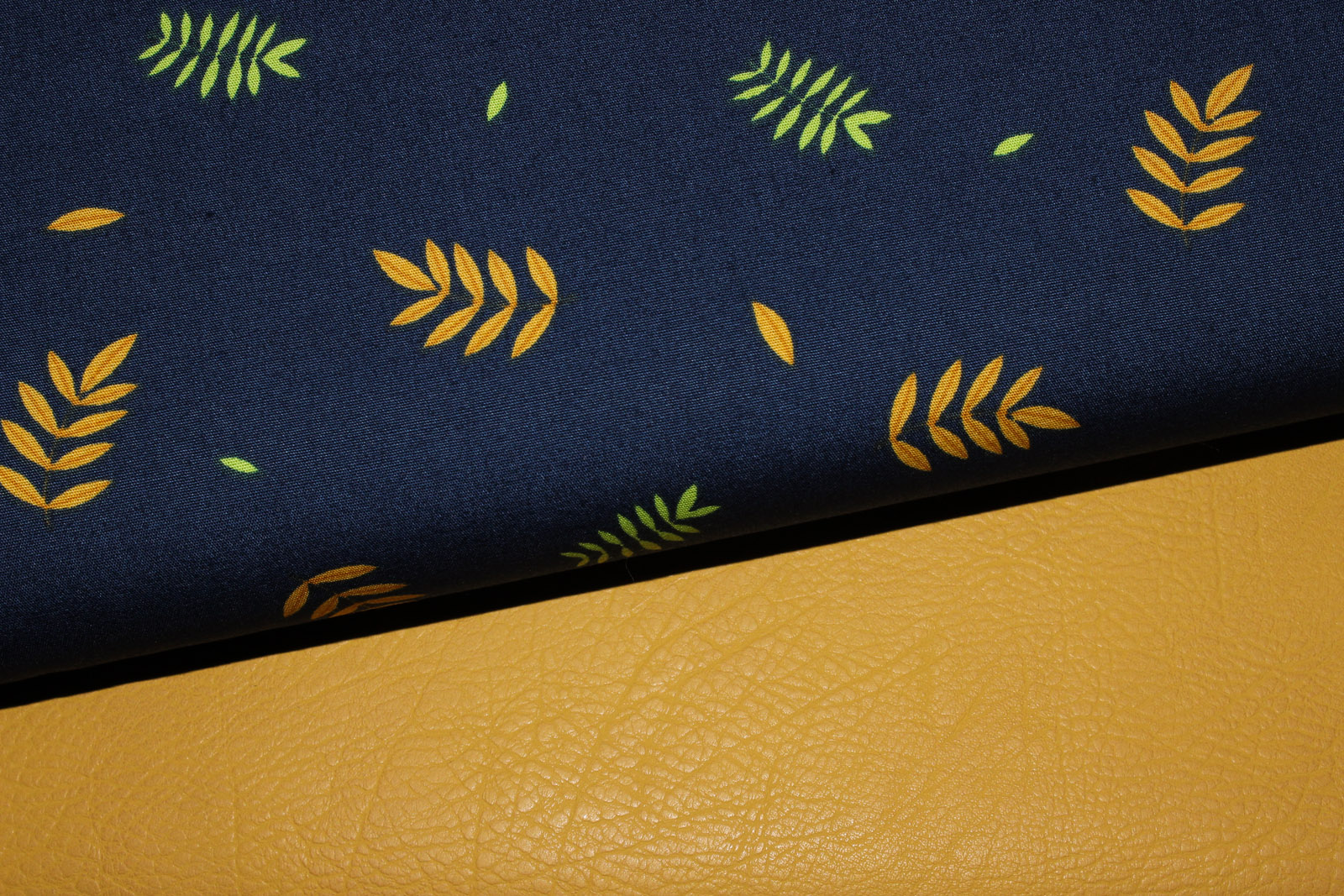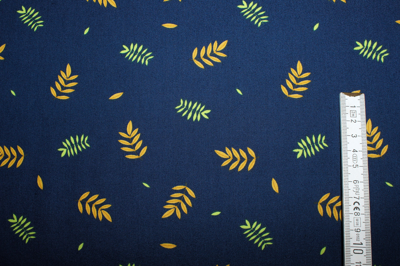 Schöner Baumwollwebstoff in dunkelblau mit Zweigen in den Farben senf und hellgrün. Die Zweige haben eine Größe von ca. 2,9 cm. Das Lederimitat auf dem zweiten Foto gehört nicht zum Angebot. Dieses dient der Inspiration.