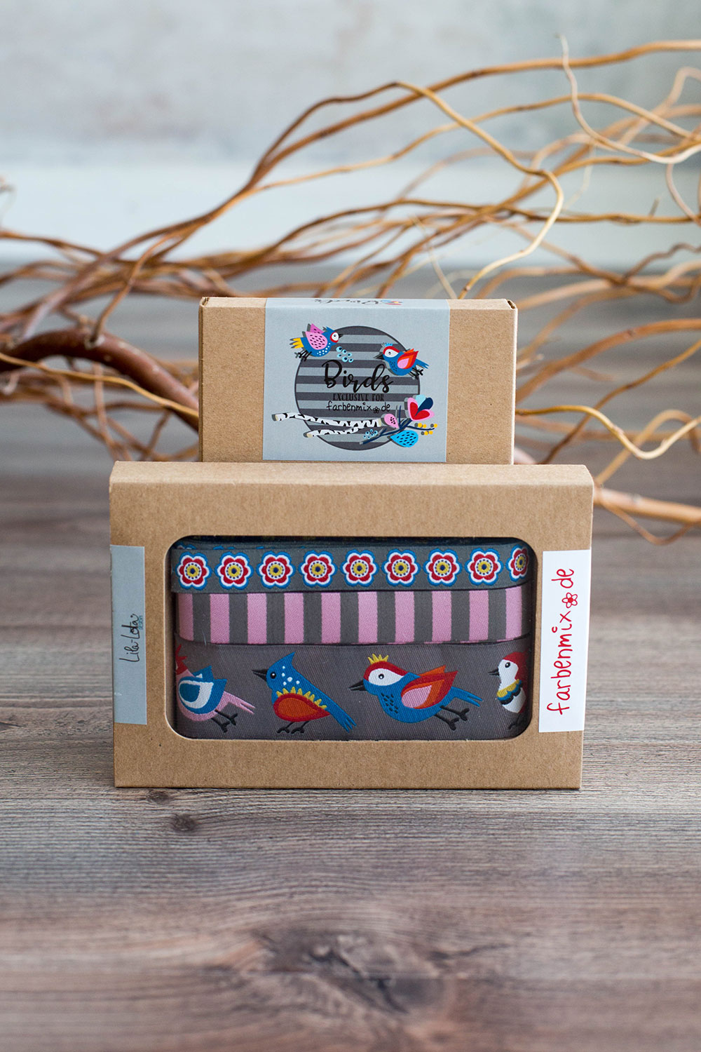 Hochwertiges Webband-Bortenset in einer hübschen Box mit Sichtfenster.