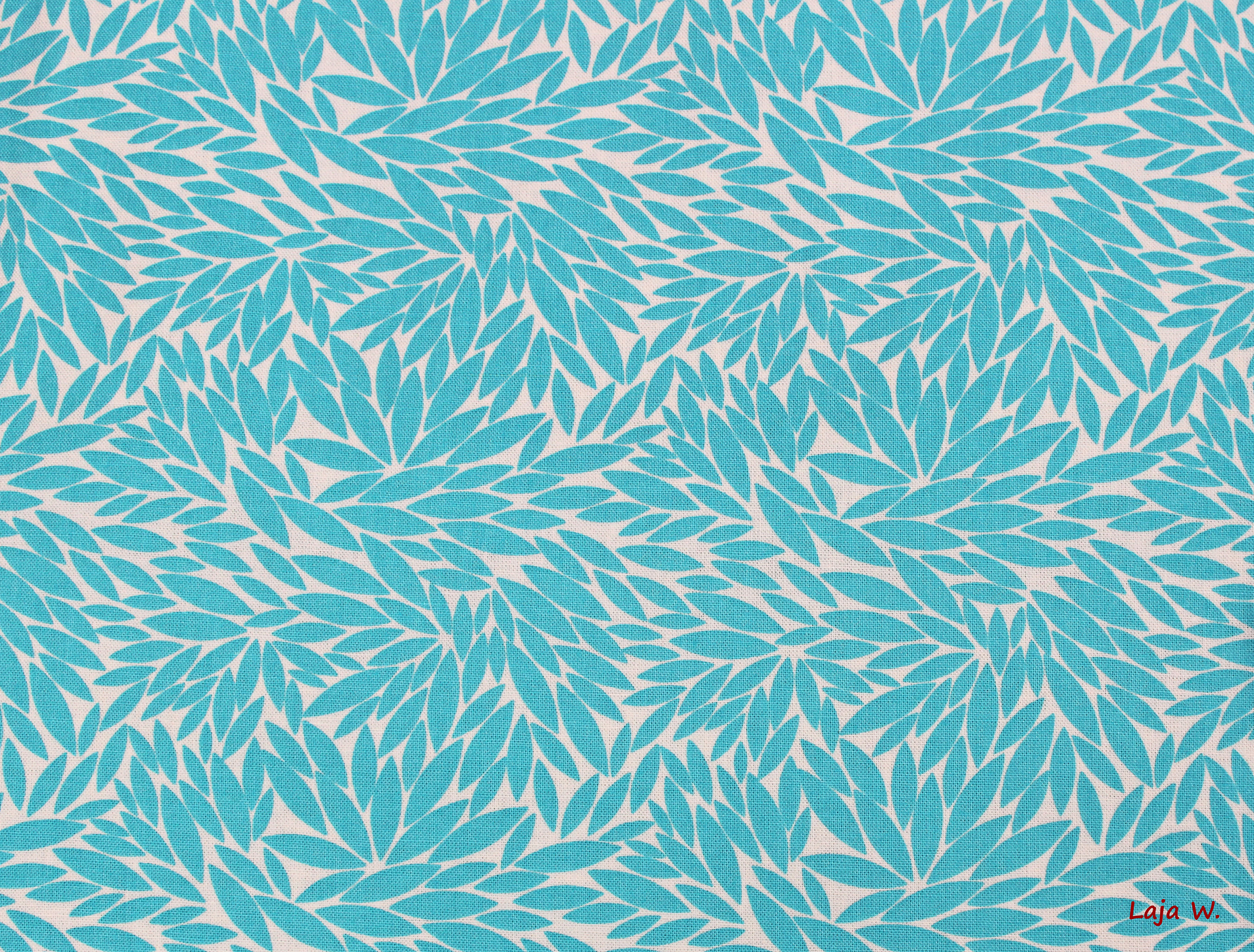 Der Untergrund des Stoffes ist ein wunderschönes ganz helles Cremeweiß, die Blätter sind helltürkis.