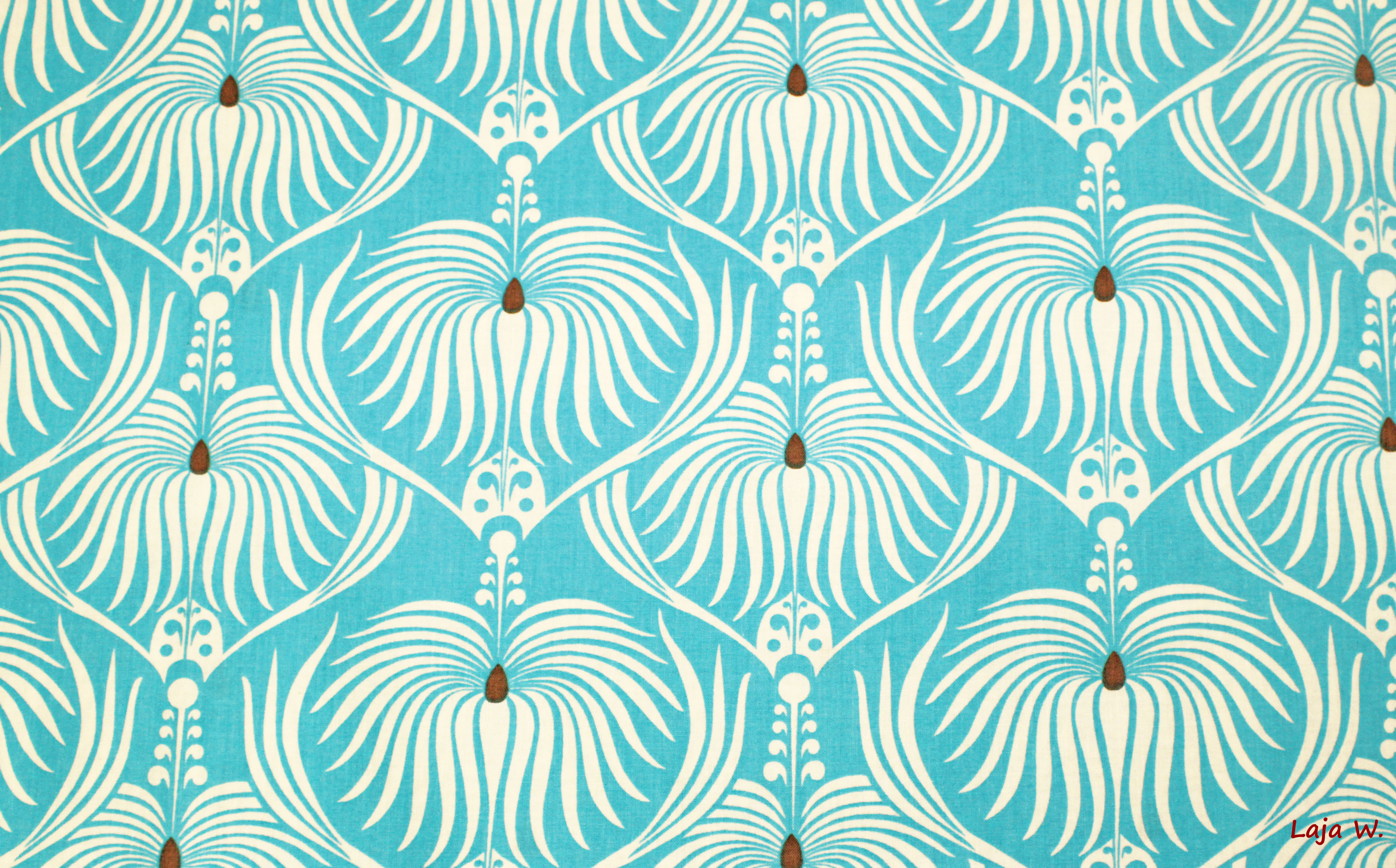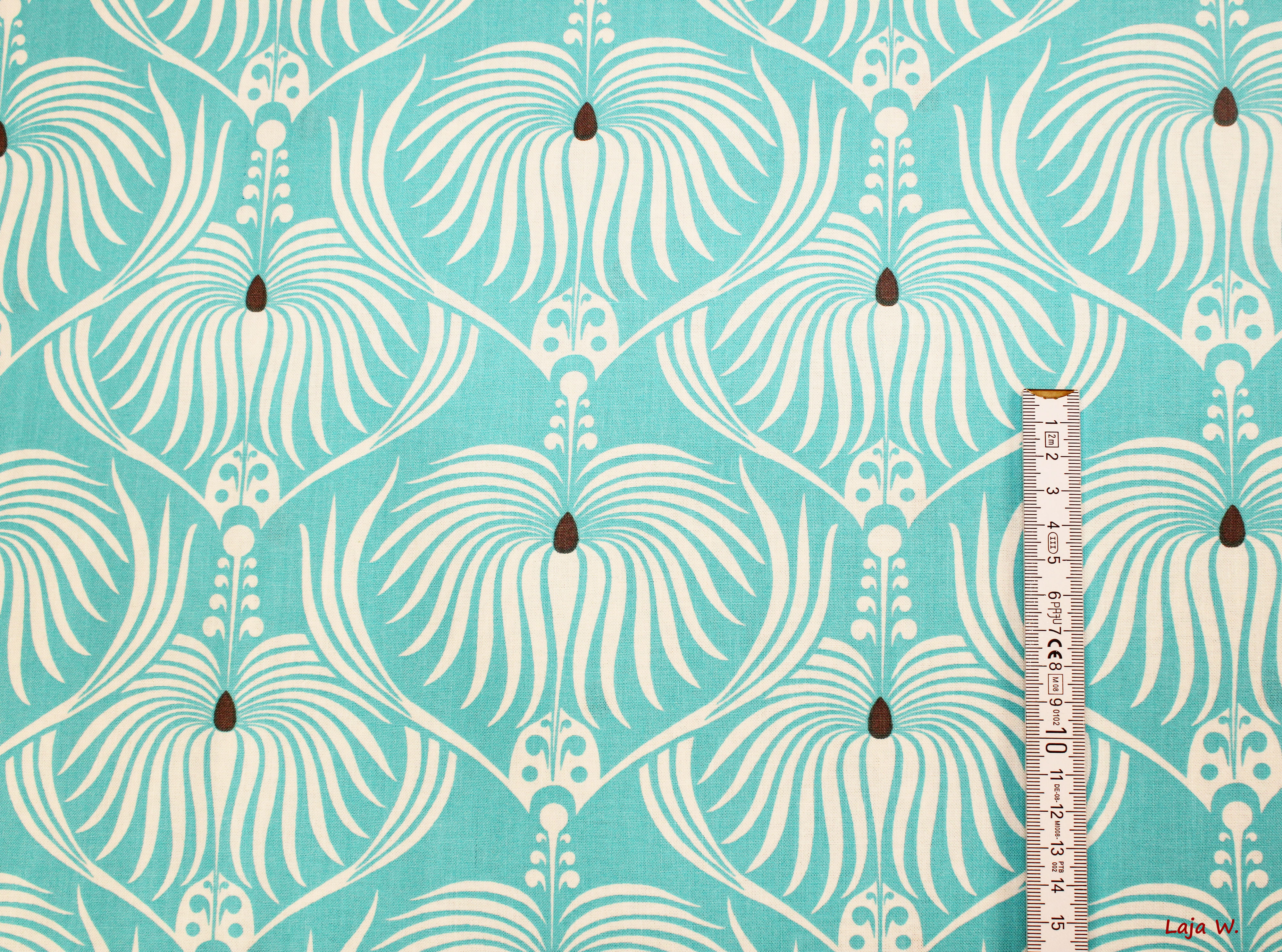 Der Untergrund des Stoffes ist ein wunderschönes ganz helles Cremeweiß, die Dahlien sind helltürkis mit einer hellgrauen Mitte.