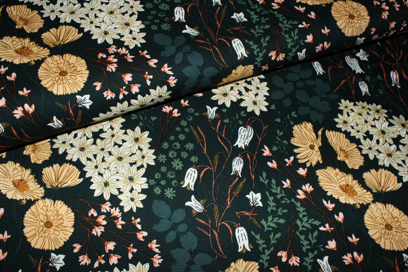 Hier biete ich Euch einen weichen Canvasstoff von Art Gallery "Canvas Bluebells & Buttercups Lark" auf dunkelgrünem Grund an. Durch die Robustheit ist der Stoff super für Taschen und Deko geeignet.