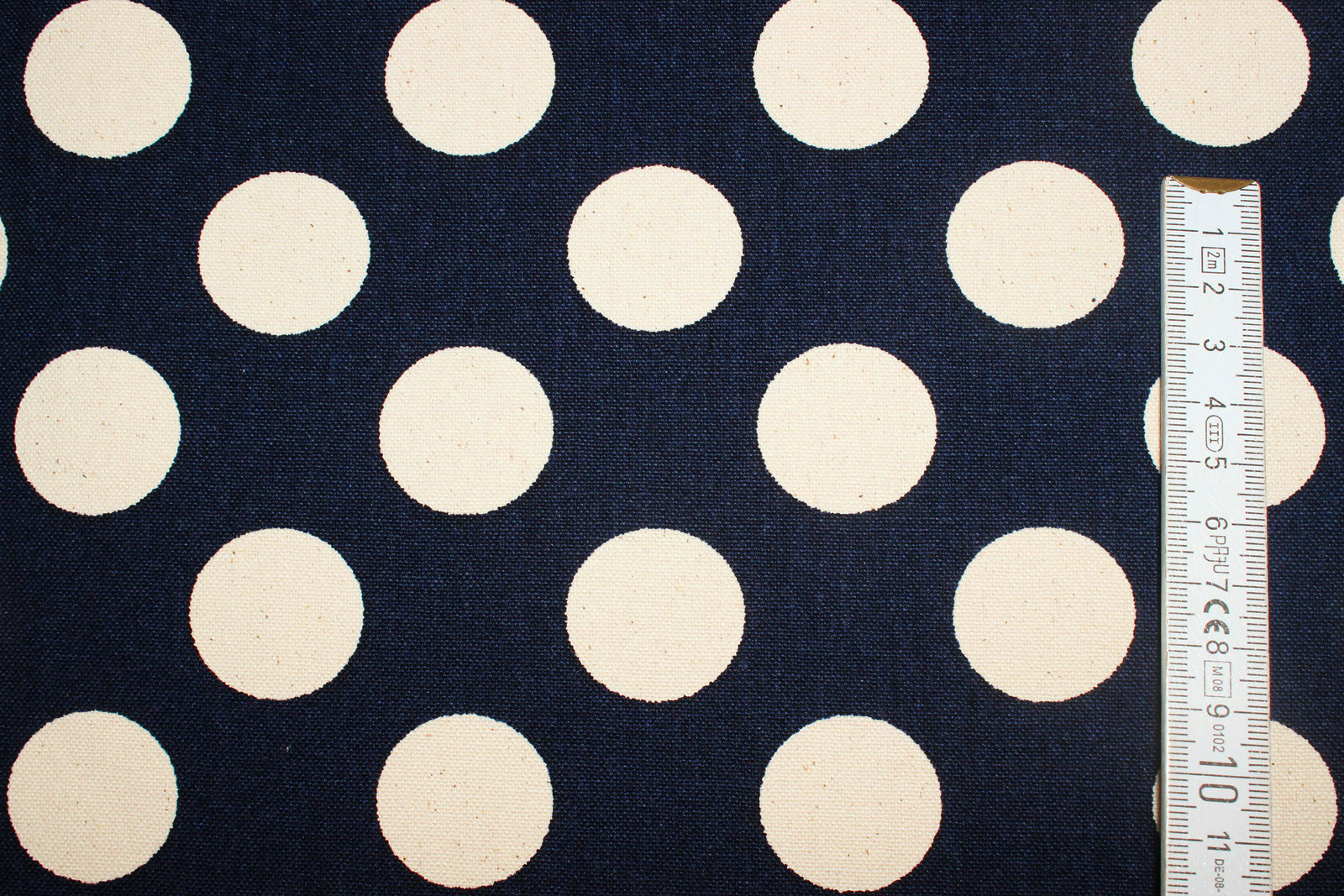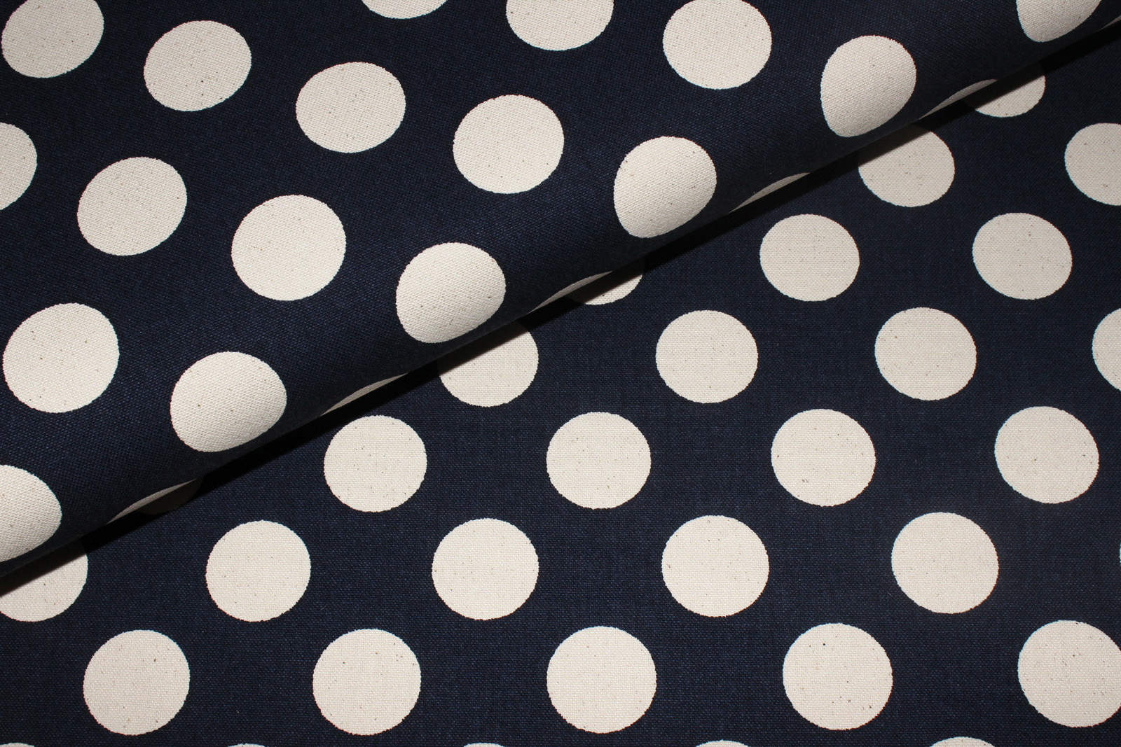 Wunderschöne robuste Designer- Baumwolle aus dem Hause Robert Kaufmann. Das Design stammt von Sevenberry, ist aber von Robert Kaufmann gedruckt worden.Der Untergrund ist nachtblau, die Kreise sind naturweiß. Der Durchmesser der Punkte ist ca. 3 cm. Der Stoff ist ähnlich wie leichter Canvas, ideal für ausgefallene Taschenprojekte, Kissen oder Portemonnaies.