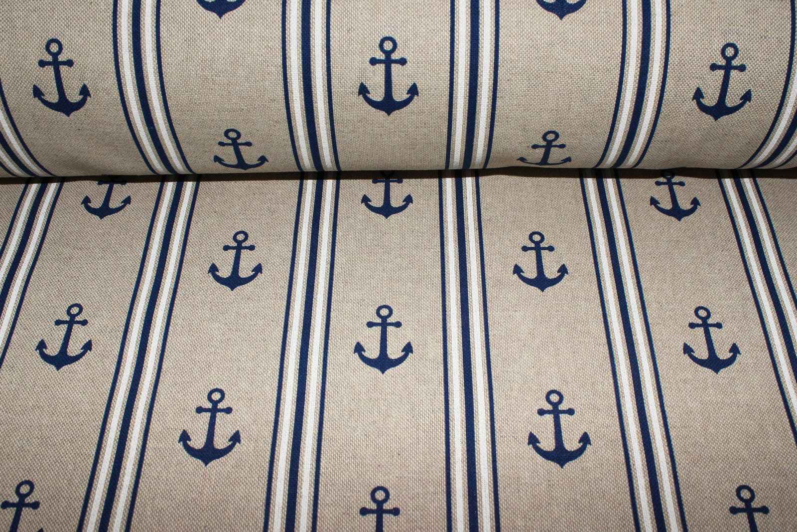 Ein wunderschöner, Half Panama Dekostoff im Leinen Look mit Ankern und Streifen. Der Untergrund ist leinenfarben.Der Stoff ist durch die Half Panama- Bindung ein wenig grober von der Struktur her als Popeline, der Stoff ist aber weich. Super geeignet für Taschen, Kissen, Tischläufer, Deko etc.